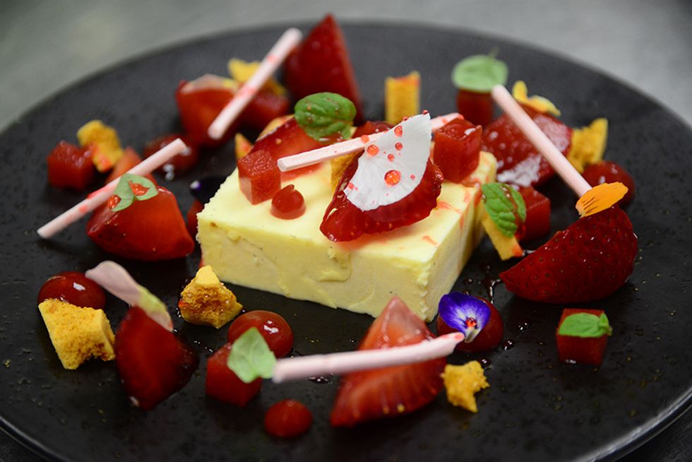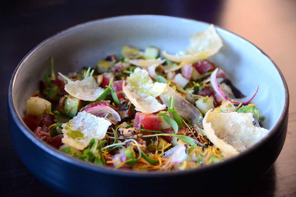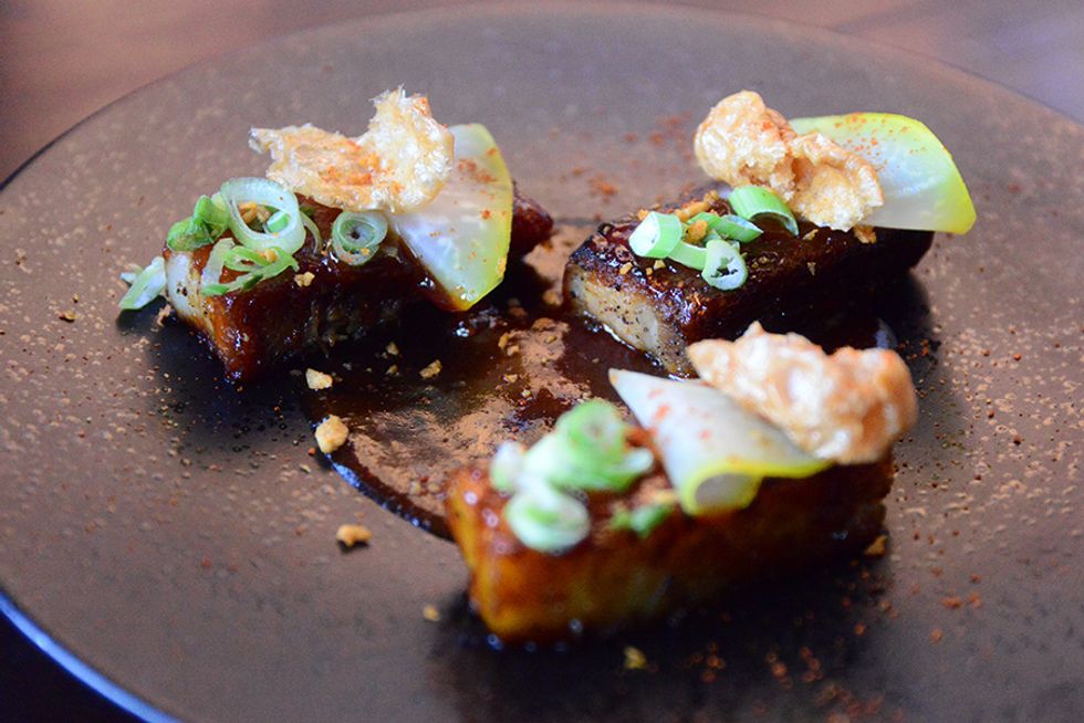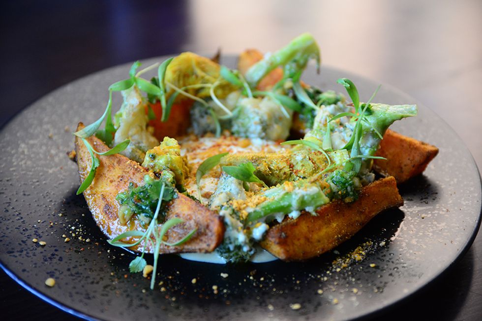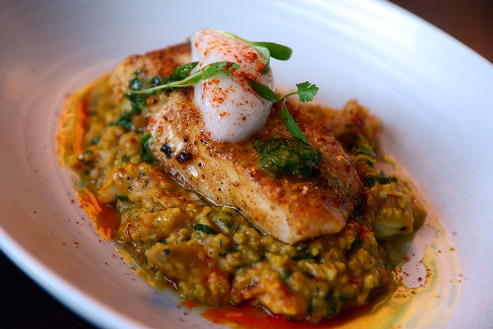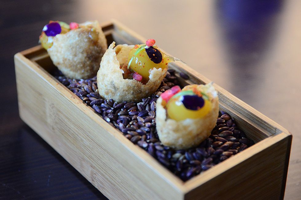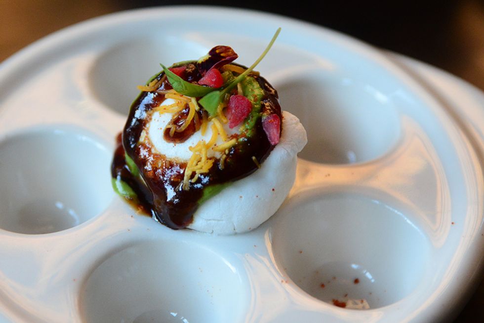 Fans of the Hawaiian dish poke, we quickly did away with Sarkar's take: tuna bhel. A mixture of puffed rice, potato, onion, cilantro, spices, green chile and tamarind, bhel is a popular street food in Mumbai, and its complex flavors and textures are a perfect complement to wonderfully fat cubes of exquisitely fresh (and sustainably caught) ahi. The potato tikki was similarly short-lived. Based on aloo tikki—fried potato cakes that are a popular street food in northern India—Rooh's version is served on a dollop of sweet-and-sour yogurt mousse and concealed in a nest of kale and spinach tempura so crispy it's crunchy. Dressed with tamarind chutney gel as well as with a mint and cilantro chutney and little lobes of frozen raspberry, the dish sings with flavor and fun.