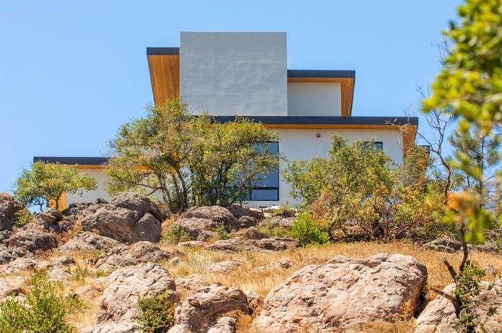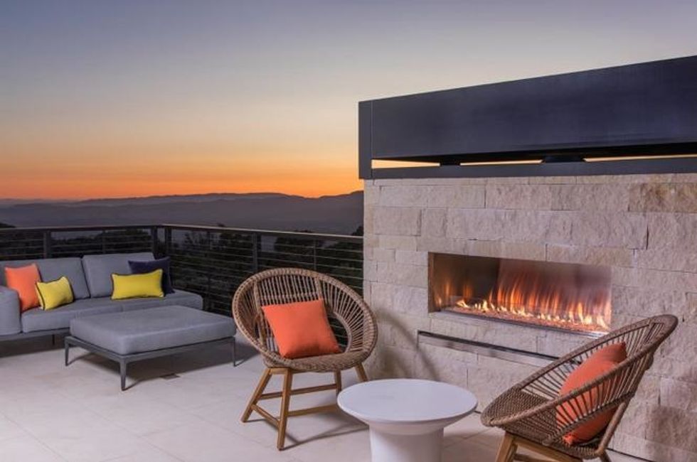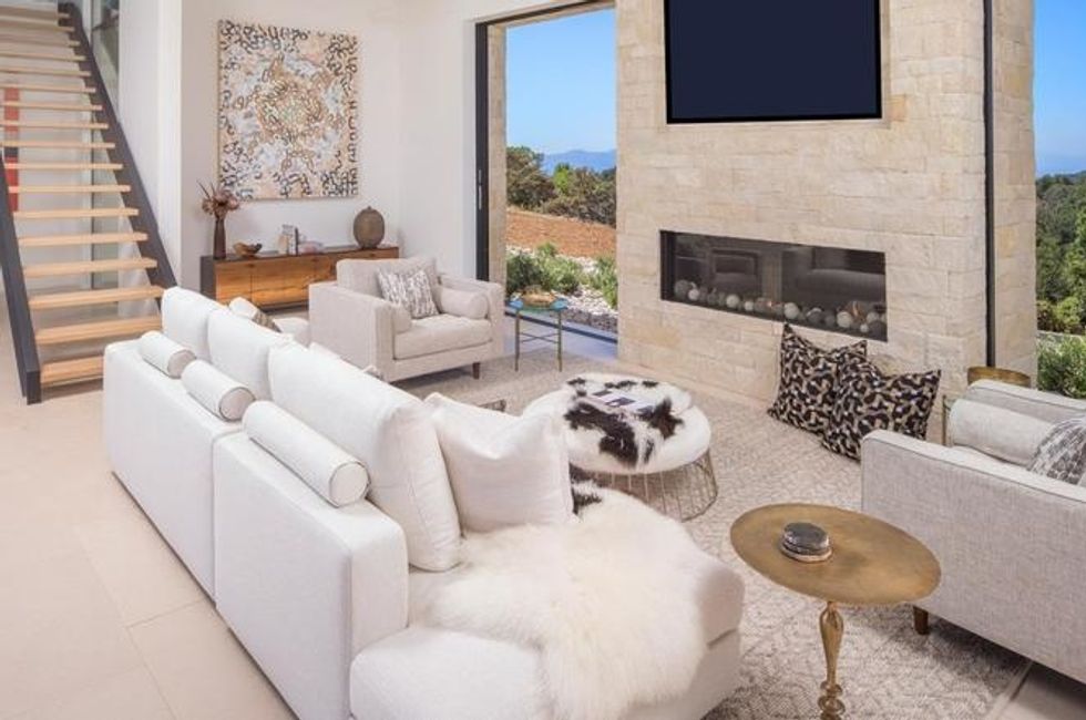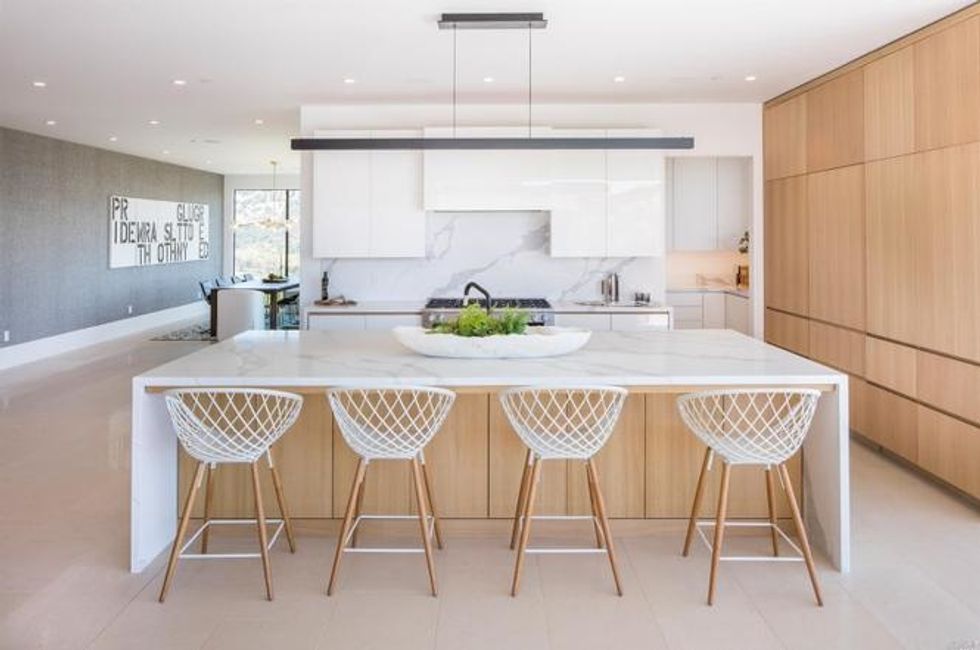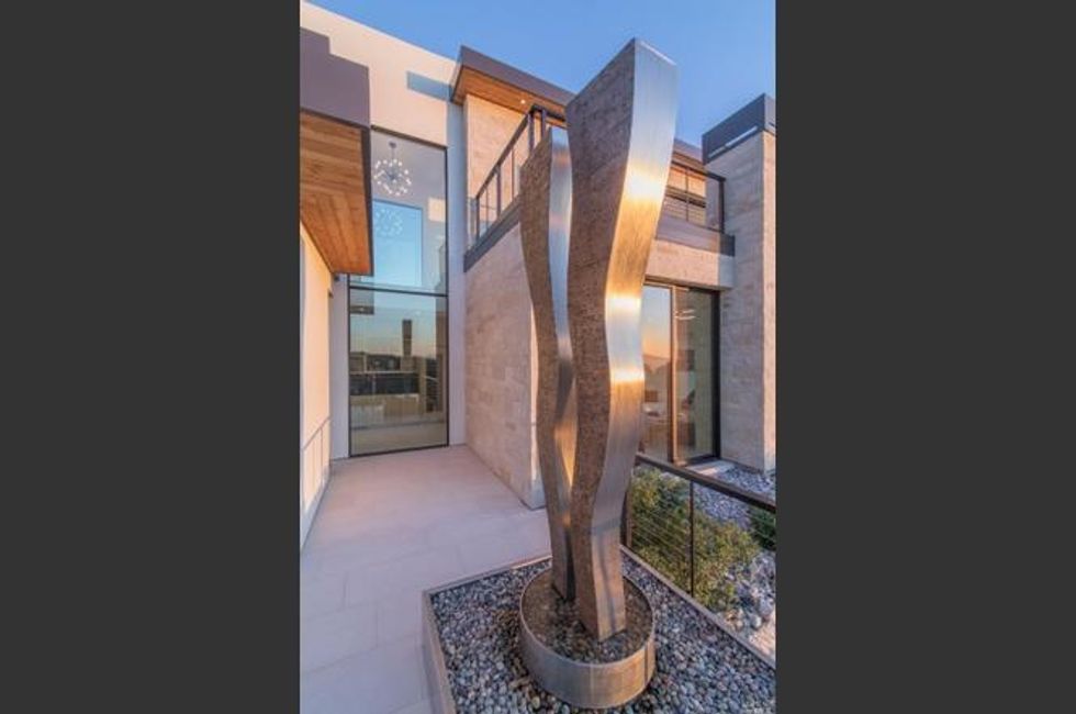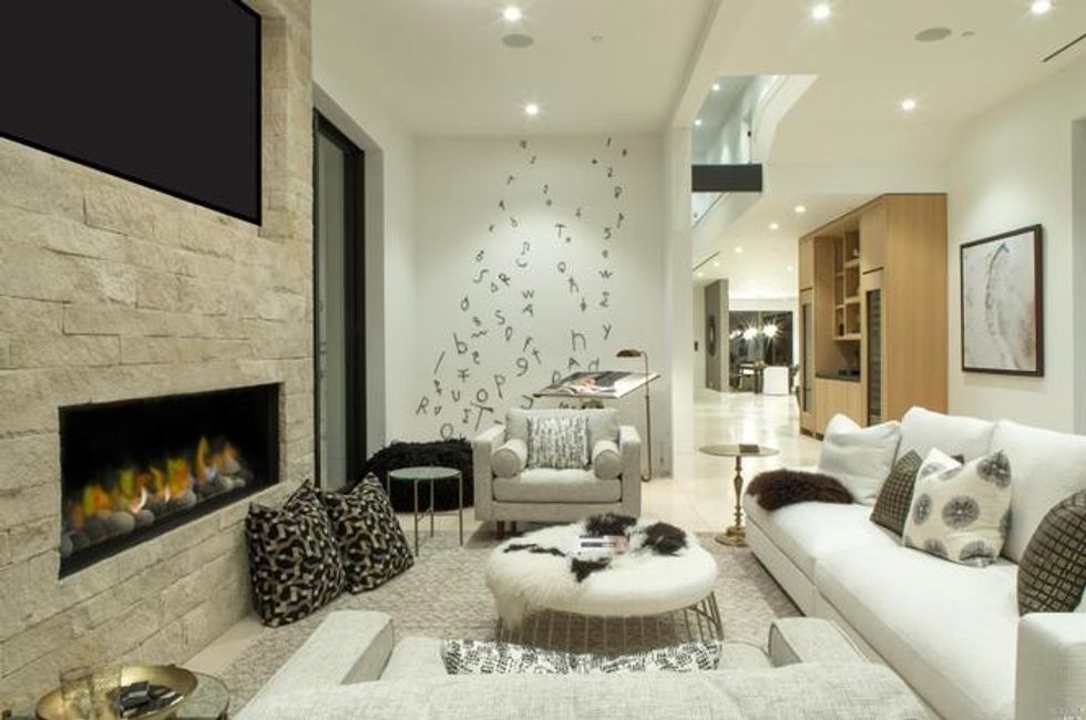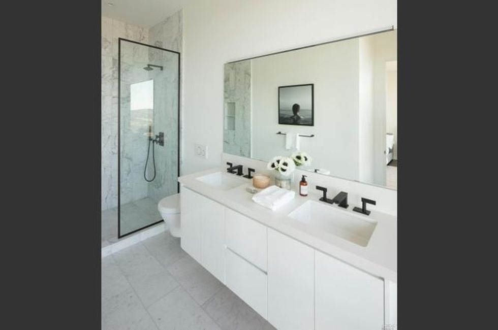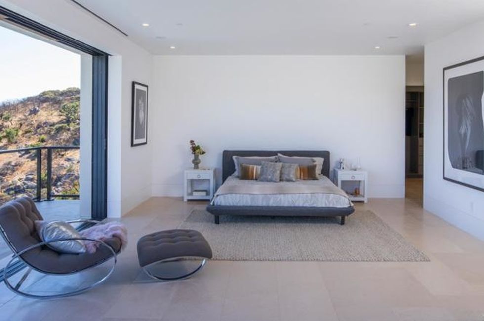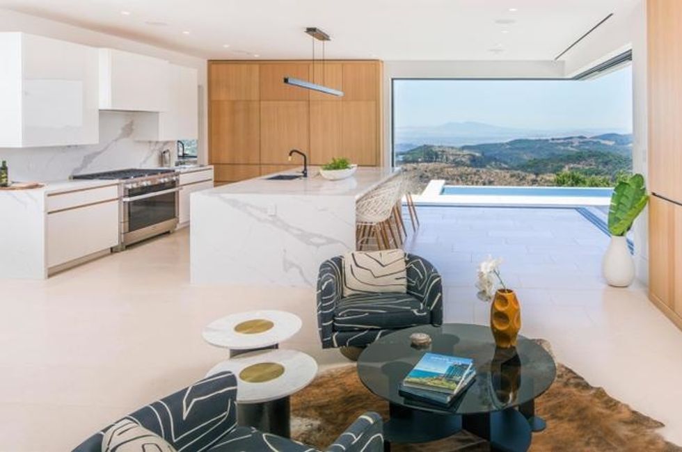 The main level houses expansive living and entertaining spaces in an open floor plan. The minimalist kitchen is clad in marble and wood and has a butlers's pantry that makes catering dinner parties easy; the formal dining area is encased in two walls of glass for an indoor/outdoor effect. There is even a bar with wine storage for saucy gatherings. Pour a glass to sip by the stone fireplace or take it outside to the fire pit overlooking the 70-foot infinity pool and spa.