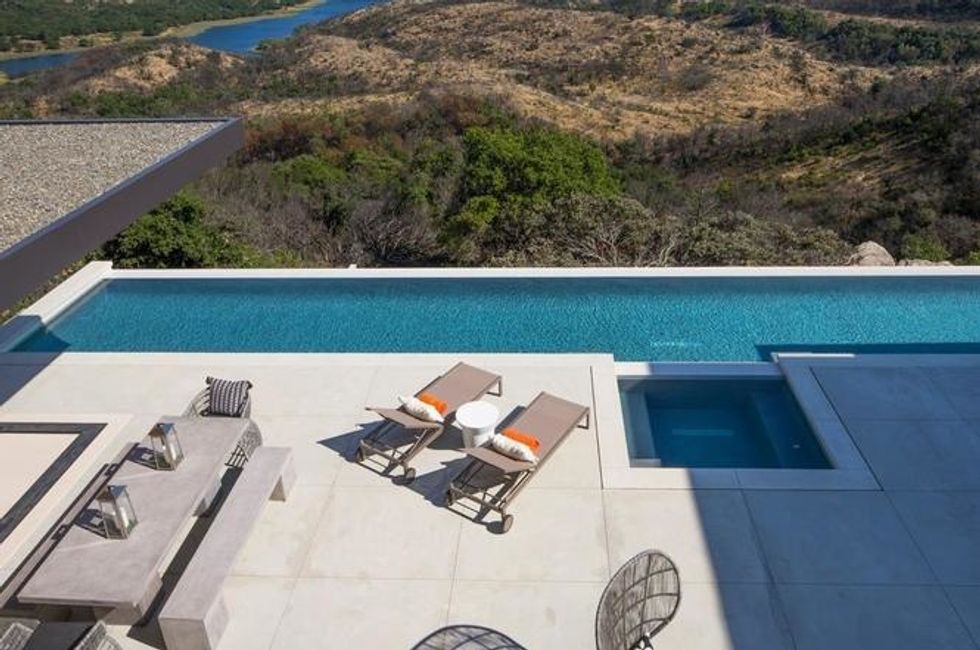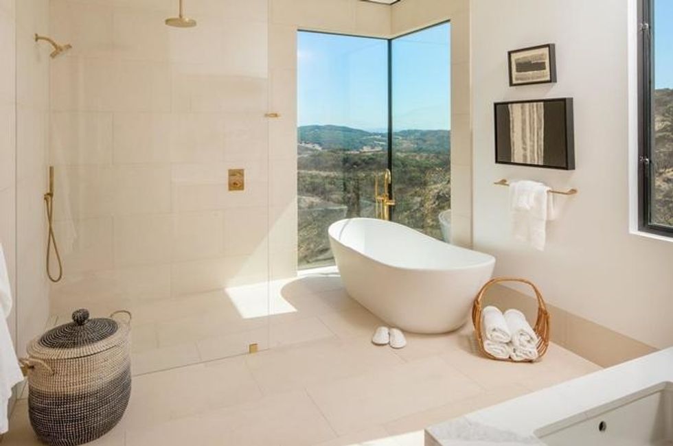 Finishing the ground floor is an office or media room, as well as the master suite with two walls that open onto to the pool. An elegant, marble-swathed bathroom has a large shower with three shower head options and a standalone soaking tub set against a sunny mountain range.
