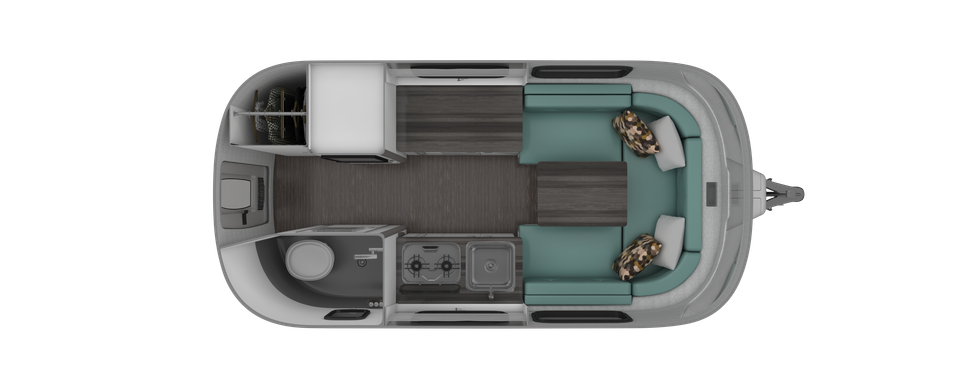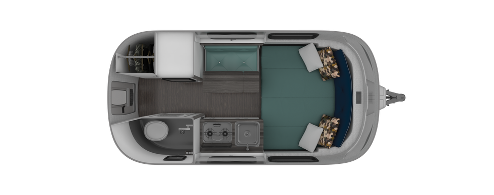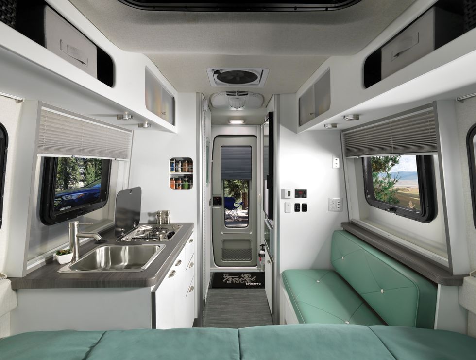 There are two floor plans, including one with a U-shaped dinette that converts into a bed, but we'll opt for the one with the permanent Tuft and Needle mattress, thank you. In addition to the queen-sized bed, creature comforts include a seating area with a tufted banquette; handcrafted Italian laminated cabinetry for ample storage; dinette cushions made with stain-resistant Spradling vinyl upholstery; a stainless steel kitchen sink; a two-burner stove; and a microwave. It comes in your choice of two color palettes: ivory with earthtones, and robin's egg blue.