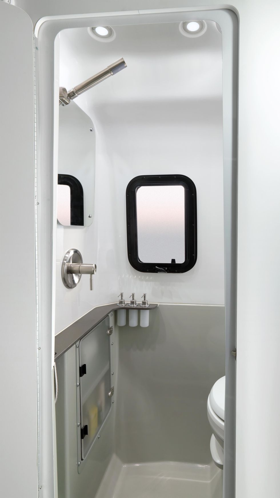 Even the bathroom is sparkling with a removable shower head, built-in soap dispenser, enclosed shelving, and a toilet. (There's also an extra exterior shower with hot and cold water.) Outside, a powered patio awning allows for the creation of an alfresco living space for daytime lounging in the shade, or relaxing late nights under the glow of the exterior LED lights.