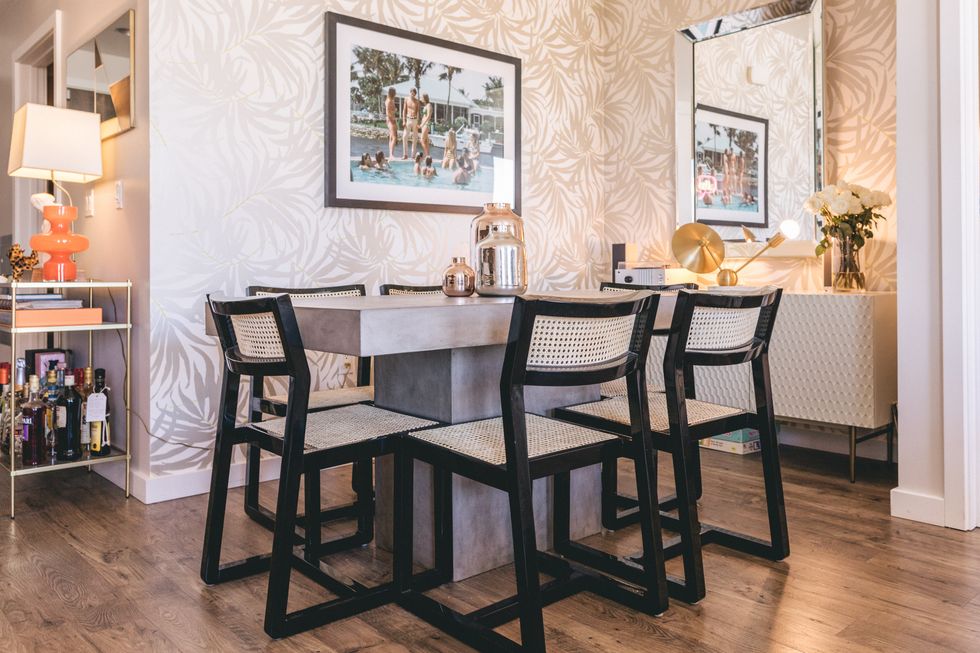 "We're especially proud of our dining room," says Williams. "It's an odd layout, so we felt the challenge of making a space that seemed definable as its own room, while still open and seamless to the rest of the apartment. Using wallpaper completely changed it."
