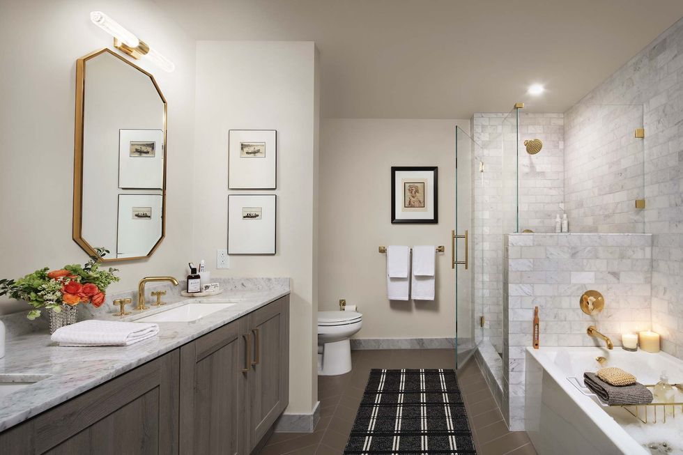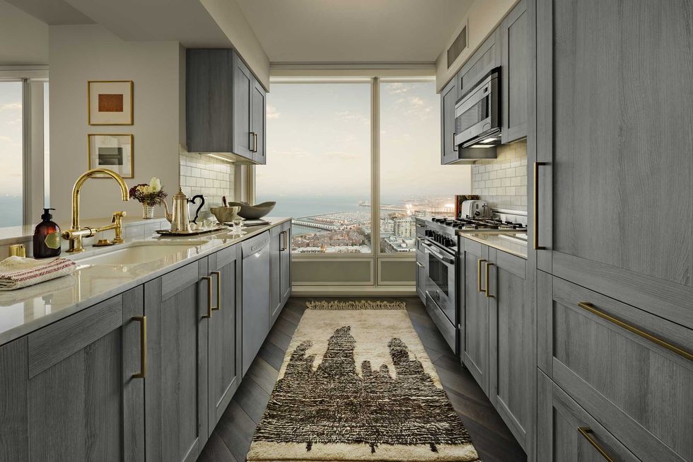 While the communal spaces function to make a refined lifestyle statement, the interiors are designed as "sophisticated refuges–more restrained and tranquil than the public spaces," describes Fulk, which is not to say that the condos are Spartan by any means. They are Fulk's interpretation of luxe minimalism fitted with organic finishes, including wire-brushed oak floors, brass fixtures from Waterworks, and Studio Becker Ash Molina gray cabinetry. Windows span the entire wall and overlook the city, water, and bridges; and even the tangle of freeways from the 45th floor exudes serenity.