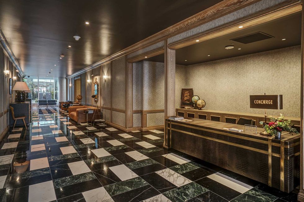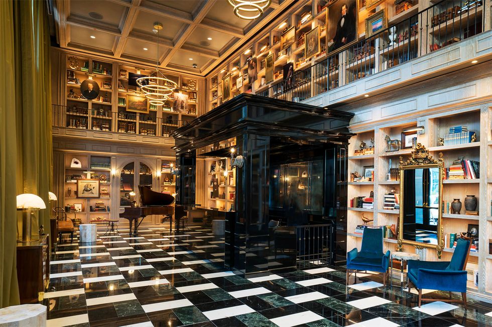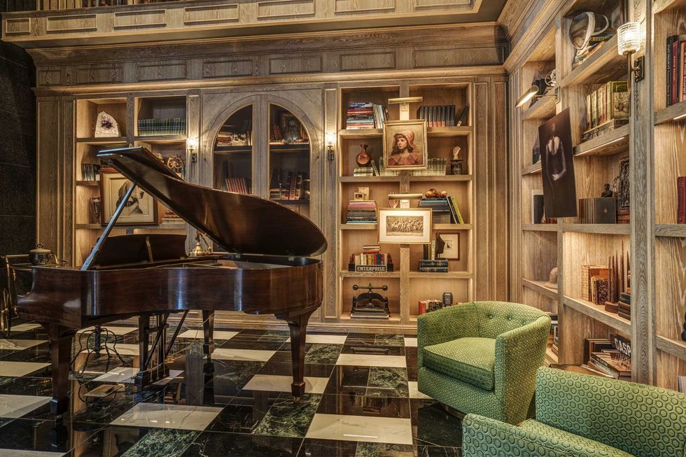Uncle Harry's bolsters another definition of luxury that's currently in vogue, one that places value on experiences that are enriching and lasting rather than on owning things. It's no surprise that travel is a recurring motif in Fulk's work. All of The Harrison's communal spaces, from its topiary-flanked entrance and seating layouts that facilitate encounters with mysterious beautiful strangers to its antique mirrored courtyard, alludes to the age of grand hotels and a life well lived. Hong Kong's Peninsula, London's Claridge's, and the recently torn down Hotel Okura in Tokyo serve as reference points. Inside the lobby, outfitted with a grand piano and floor-to-ceiling books and artwork, you may very well be an international person of mystery, not the harried startup executive frantically rushing out the door to catch an Uber.