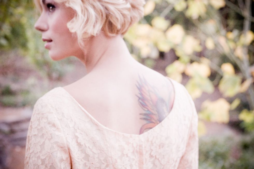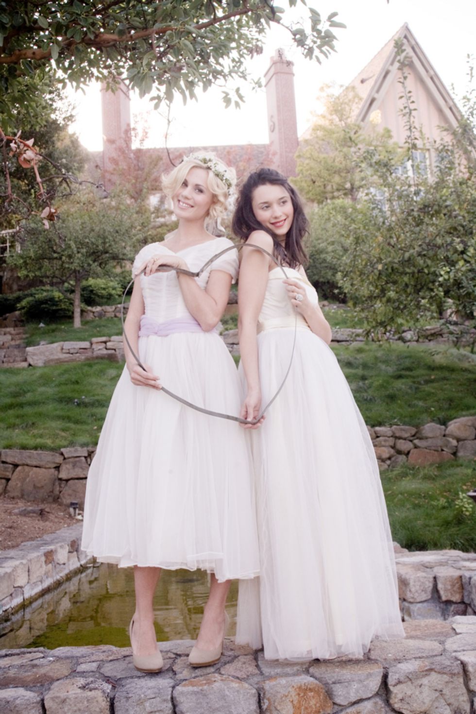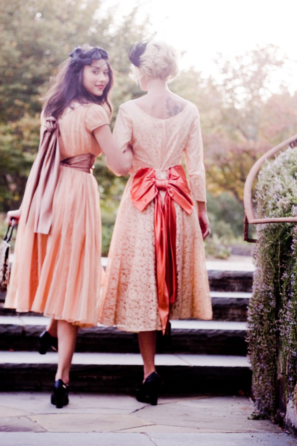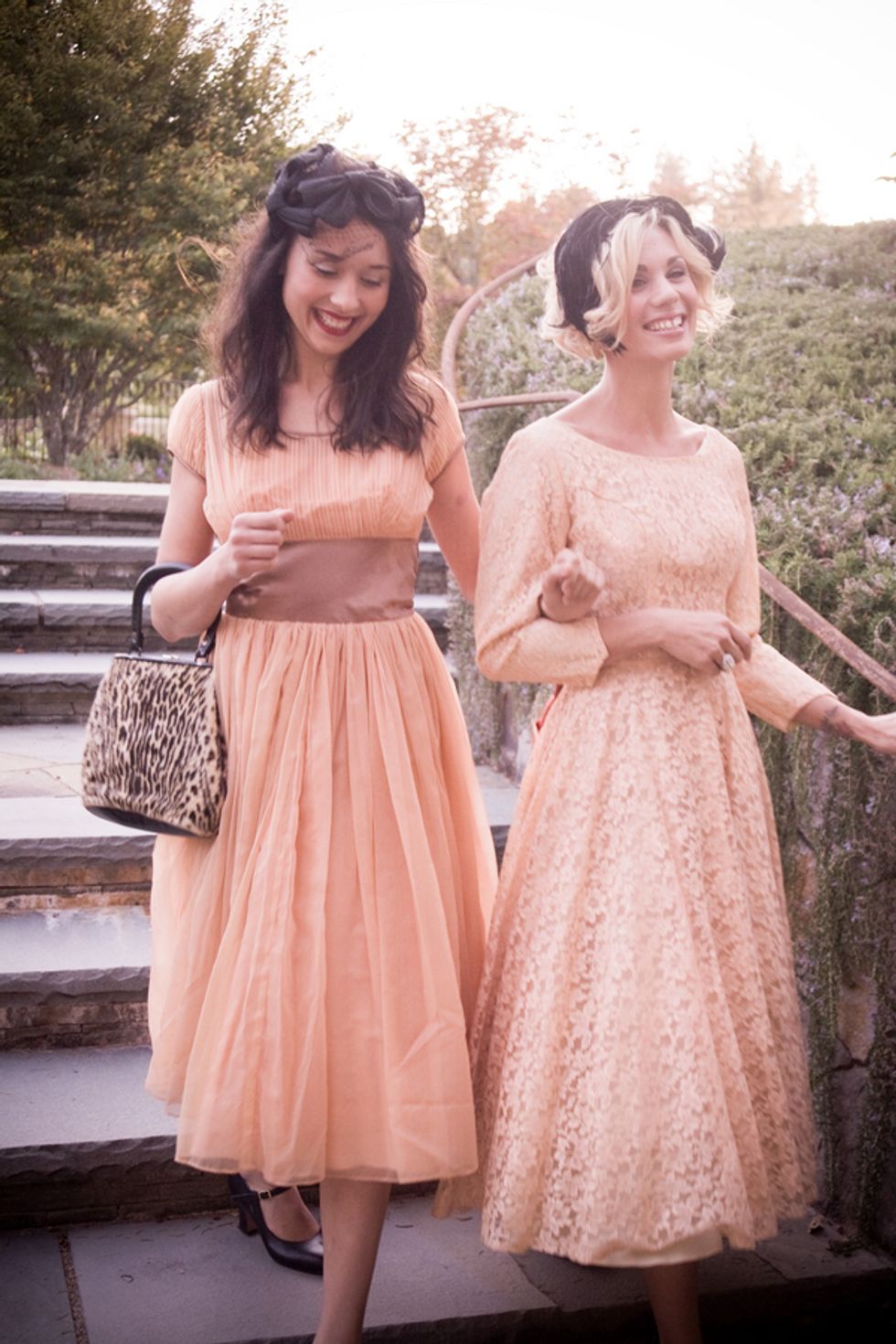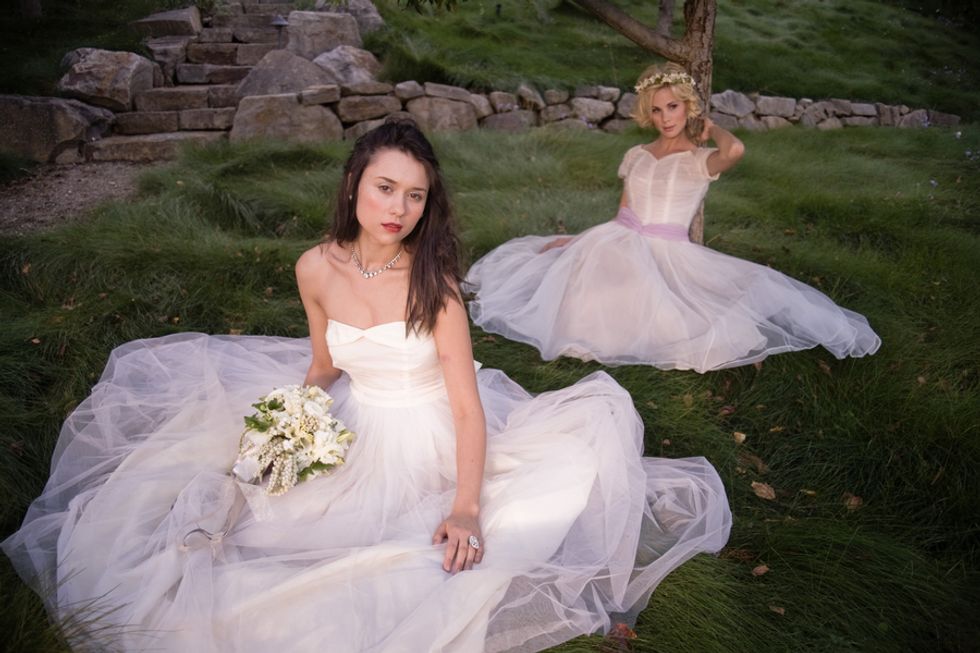 The last wedding dress of the day to shoot was a 30's empire waisted french lace gown with puffed sleeves. Such a unique and stunning dress. Katrina rocked it amongst the Madrone and Birch trees. The texture of the trees coupled with the delicate lace of the dress was perfect. Lastly, the ladies slipped into two vintage party gowns. Bre frolicked around the estate in a 50's all lace, full skirted, bow back dress. And, Karina wasn't far behind her in an Emma Domb Organza Frock with accordion pleats and back satin rosette.