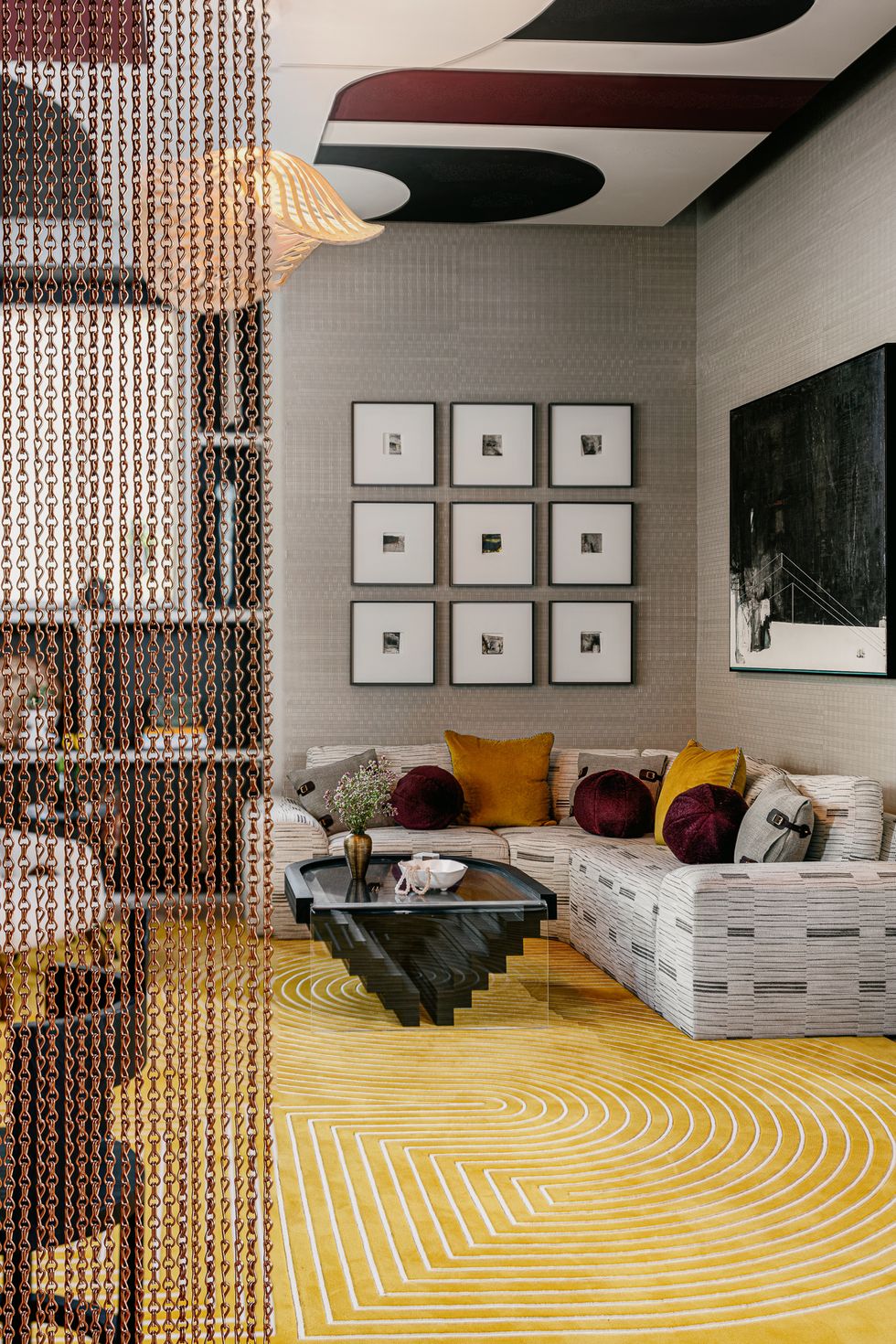 Called the Liquid Lounge, the Tineke Triggs–designed media room takes its cue from the Memphis design movement founded in the early 1980s by the legendary Milanese designer Ettore Sottsass. The mood is light and bright with lots of texture, modern art, and geometric patterns. The room's anchors include a custom sectional sofa by Arden Home; a Jean de Merry sideboard sourced at Coup D'Etat; Birnam Wood Studio's geometric coffee table; and David Trubridge's Navicula chandelier.