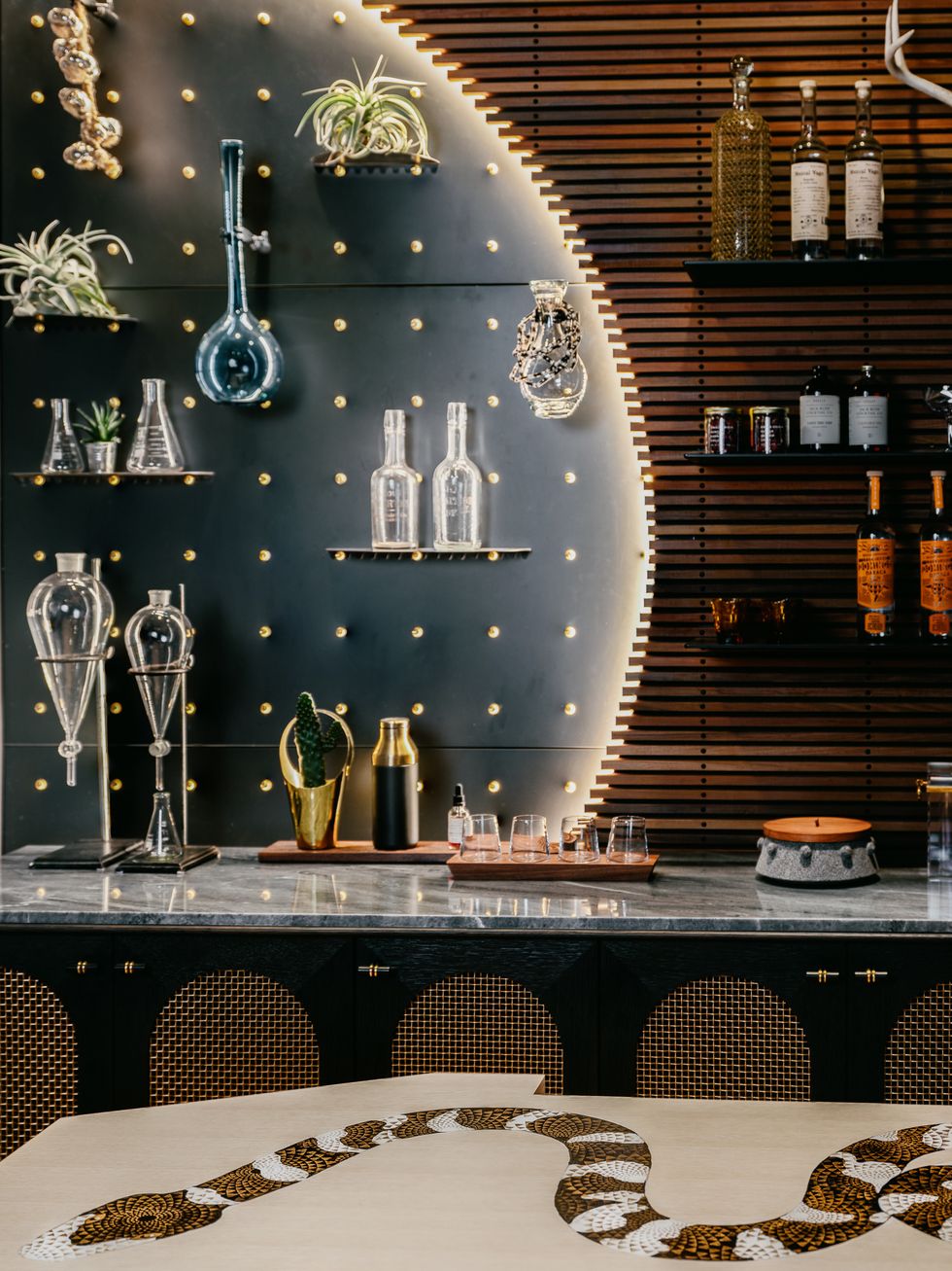 From the home's media room called the Liquid Lounge—an '80s-chic hangout, also designed by Triggs, with low-slung furnishings and geometric patterns galore—you'll get a tease of a view into Cala Mezcal through a gold chain curtain. Pull it back and ta-da!—your very own cocktail lounge that has the plushness of a Mexico City nightspot, the rustic hipster vibes of a San José del Cabo cantina, and floating shelves for all your artisanal Oaxacan spirits.
