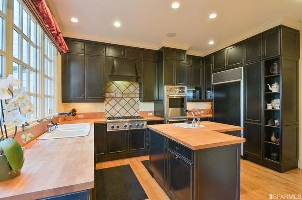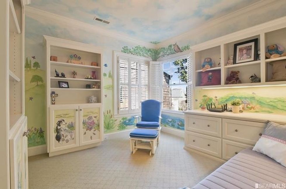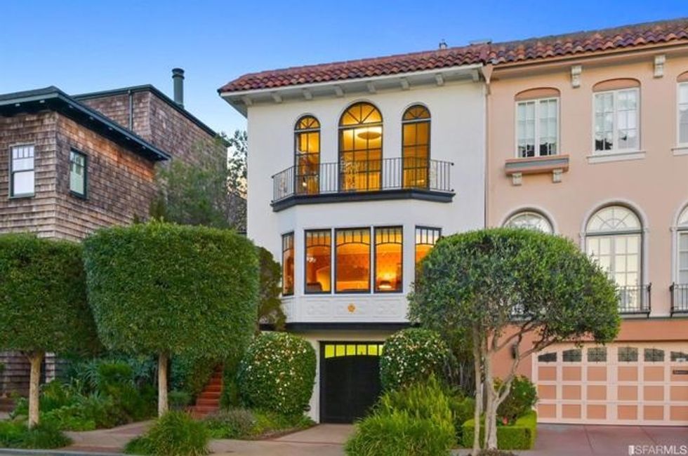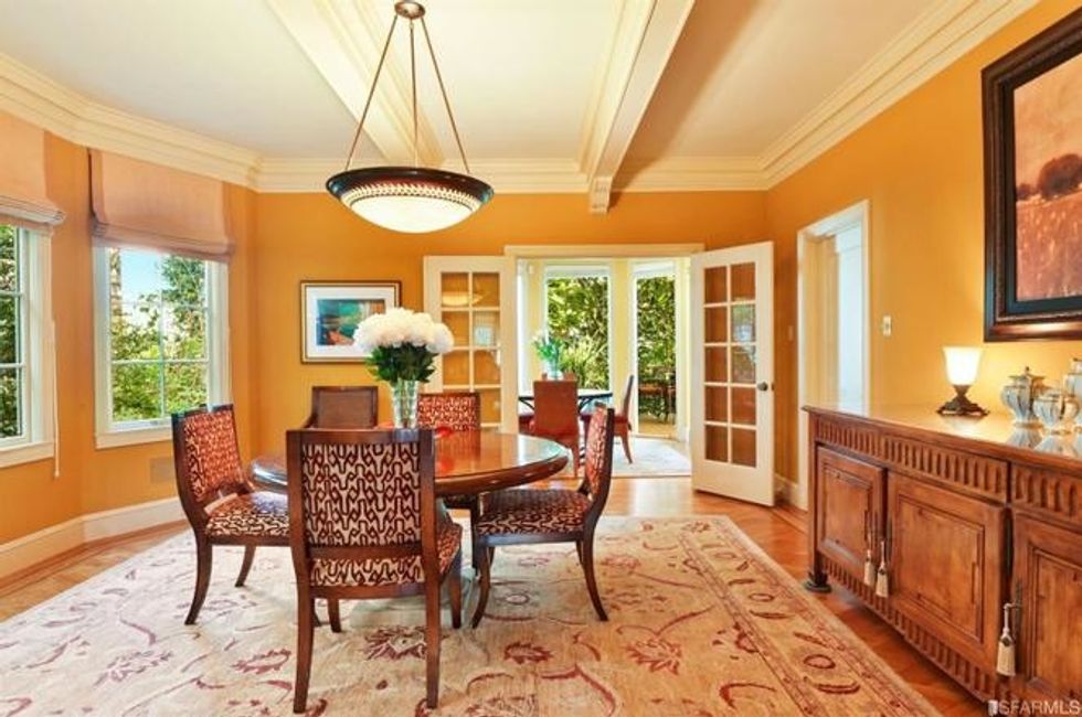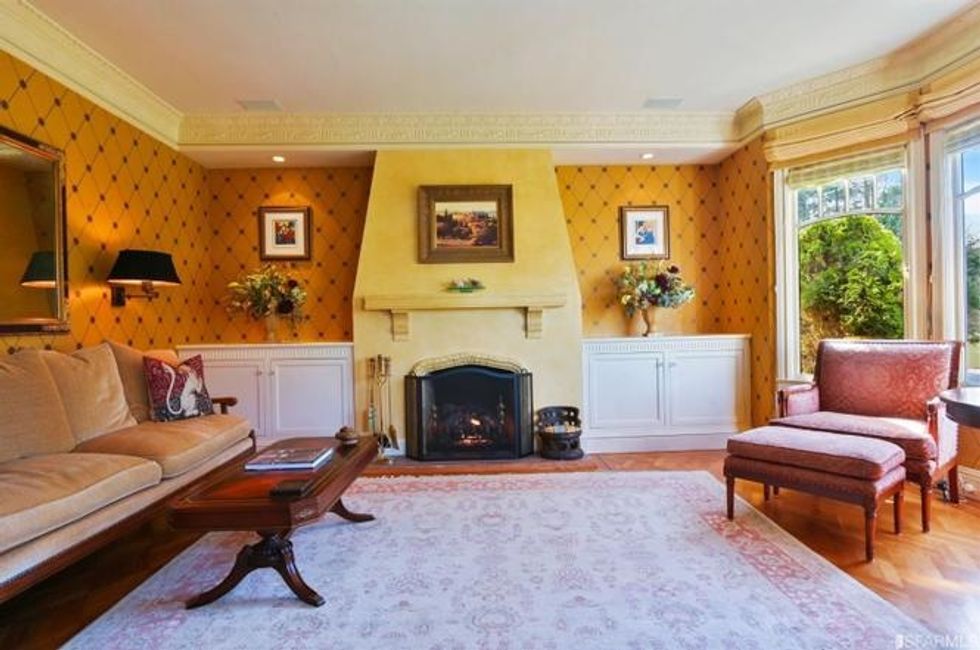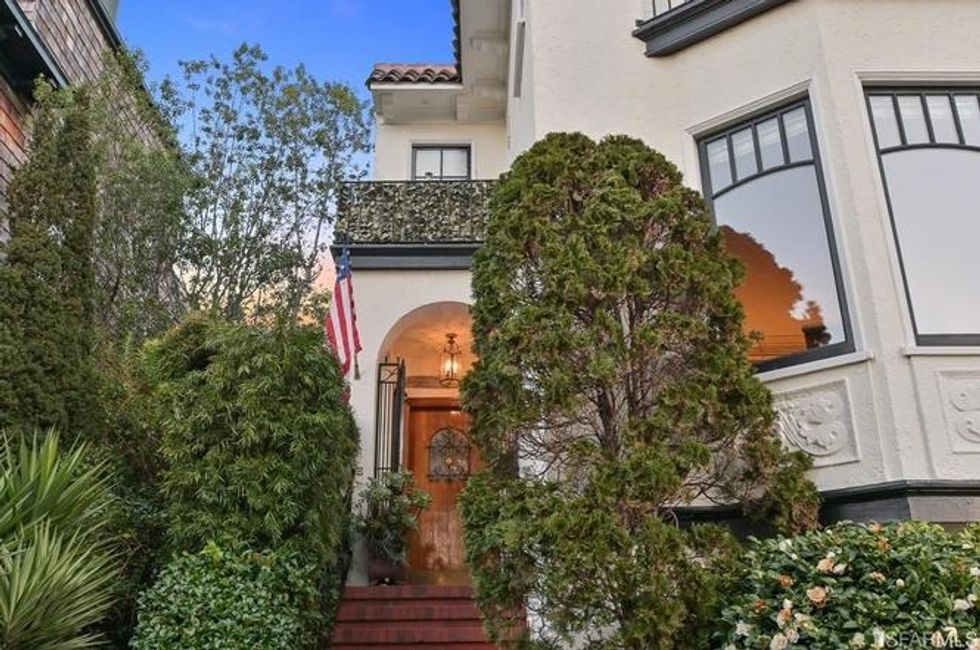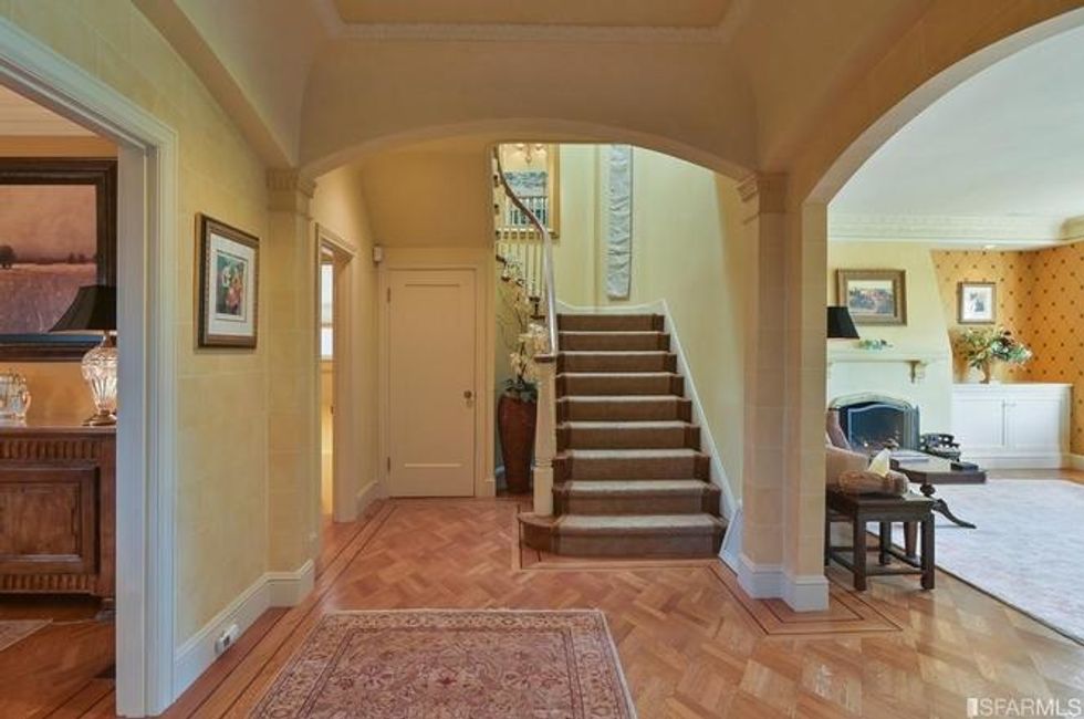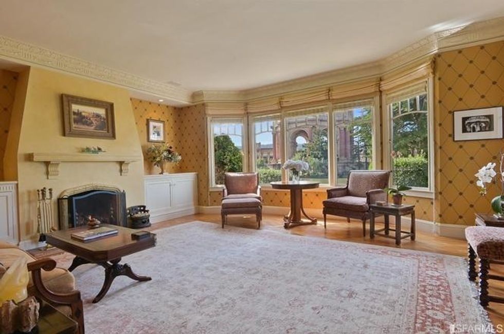 The Italianate-style Marina house sits alongside the lagoon surrounding the Palace of Fine Arts, whose fanciful Beaux-Arts architecture sets the tone for the three-story home's proper styling including graceful archways, pilaster-style columns, parquet floors with walnut inlay, a trompe l'oeil stone wall, high ceilings, and original moldings.