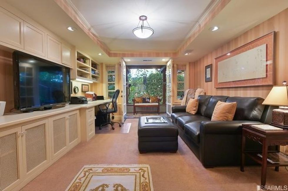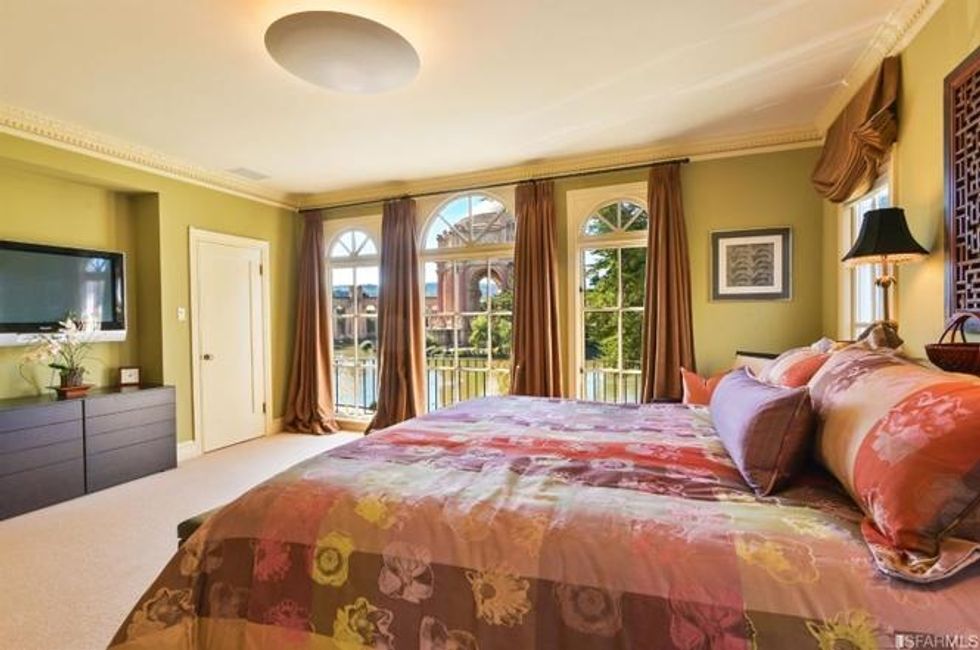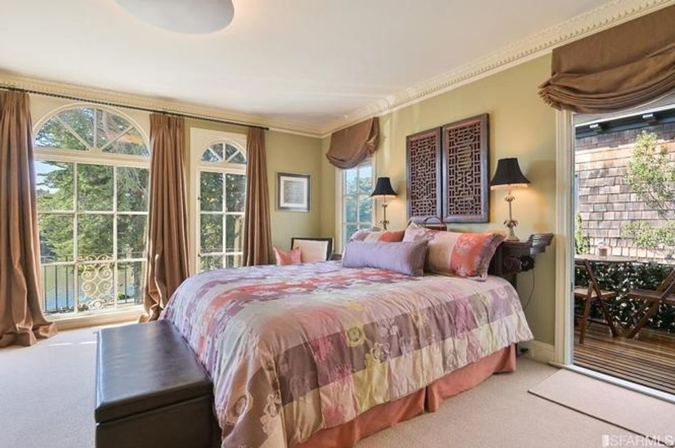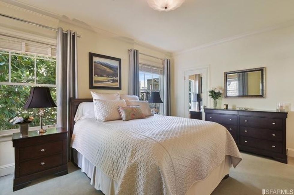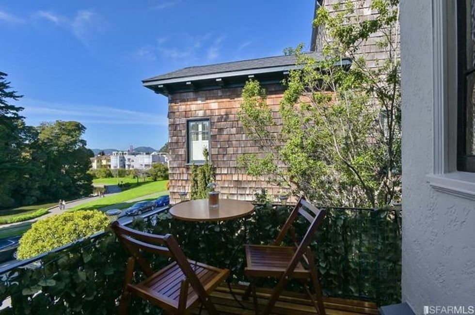 On the second level, the master suite flaunts the same epic views of the surrounding park and lagoon through arched bay windows, but also allows a closer perspective via two step-out terraces that offer glimpses of the Golden Gate Bridge. Rounding out the second floor are two more bedrooms with built-in cabinetry, ample closet space, and a shared, remodeled bathroom.