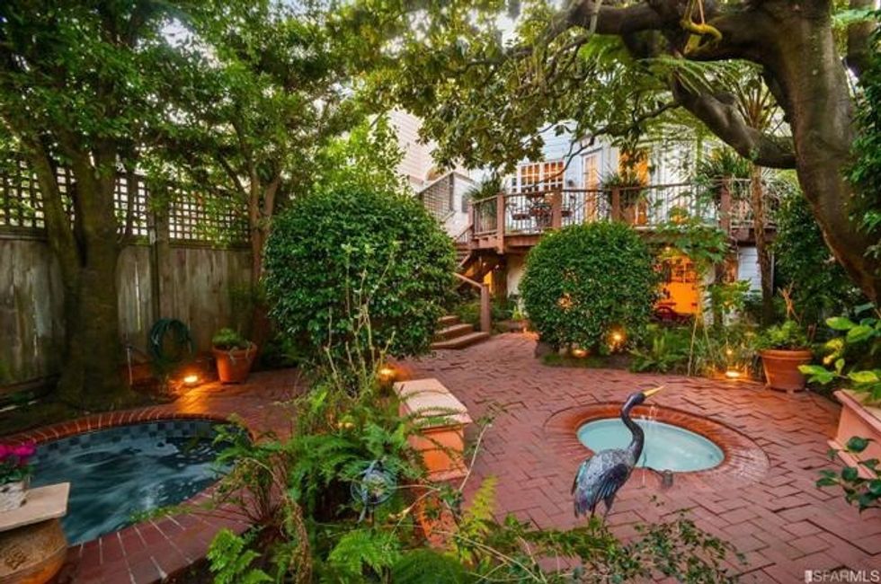 Outside, the lush garden, by landscape designer Penney Magrane, is a soothing space to unwind among mature magnolia trees, a fountain, and brick patio. A quaint path leads to a water feature and hidden jacuzzi. A designated speaker system completes the serene oasis.
