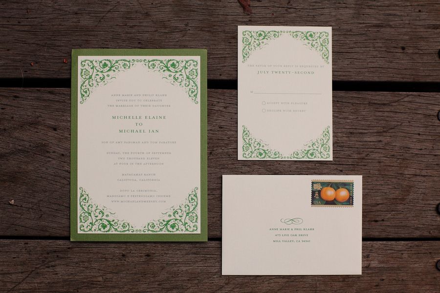Their wedding was all about Italian inspiration: espresso cart, limoncello, all family-style dishes, celebrating the local produce harvest. They had most of their close friends and family staying at the ranch for the three day weekend so they planned it like a week-long party. Michael once went to at a villa in Umbria and spent the days before the wedding playing soccer and bocce ball, lounging by the pool, hiking. It was a whole weekend of fun and celebration, not just the wedding.