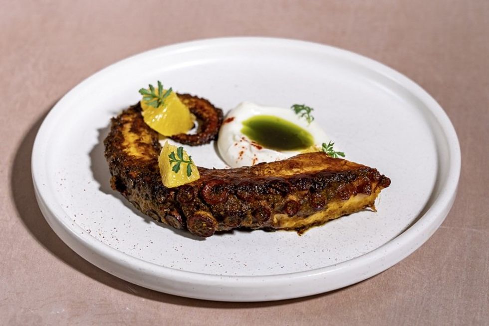 Slow-cooked octopus with Jaffna curry leaf rub, yogurt, pomelo, mint, and purple radish at Copra.