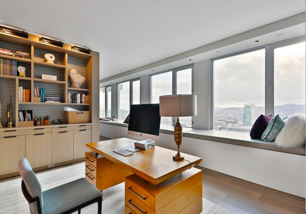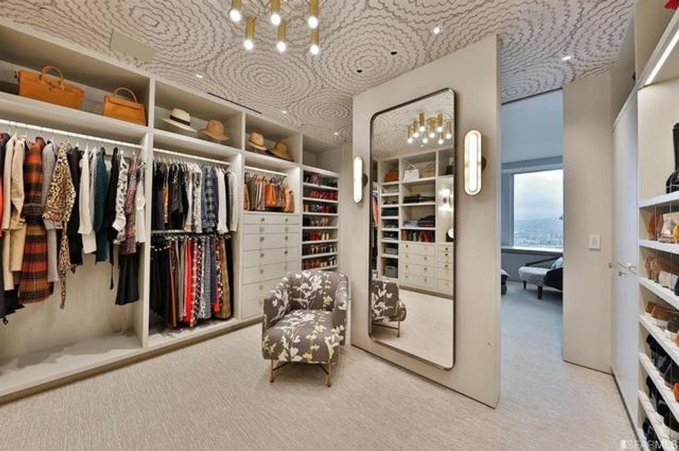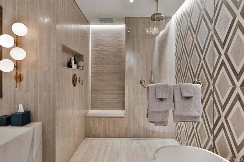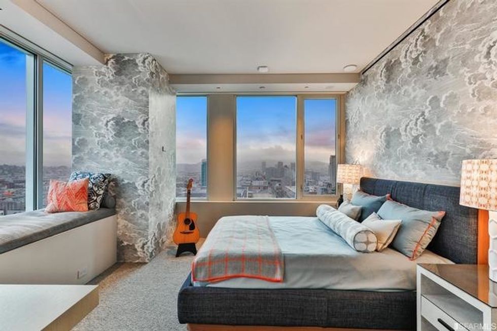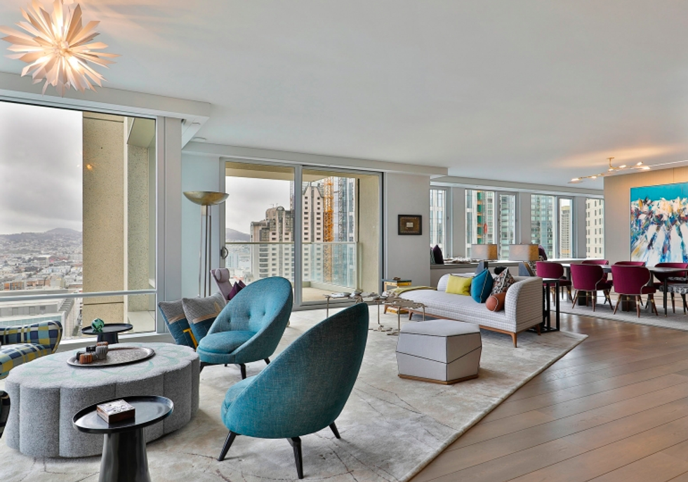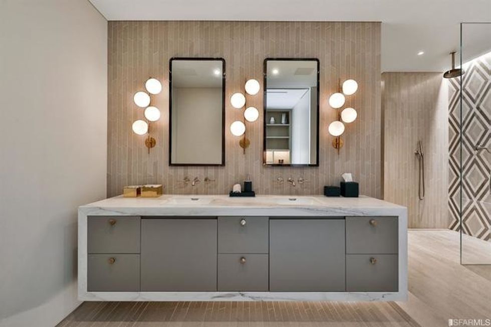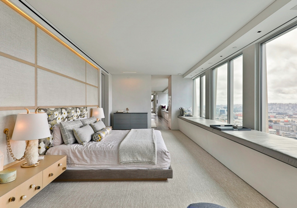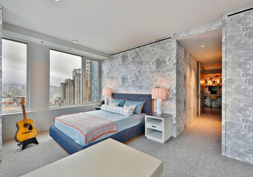 Each space is its own experience. While common areas pop with a coral-toned sofa, scarlet dining chairs, and sunny counter stools, the master bedroom is a study in tranquility, dressed in organic shades of gray and white that exactly echo the colors of San Francisco through the wall of windows opposite the bed. There is a massive walk-in closet, naturally, with a wallpapered ceiling and glam pendant lighting, as well as a spa-like bathroom featuring more midcentury-inspired patterns and a grand soaking tub.