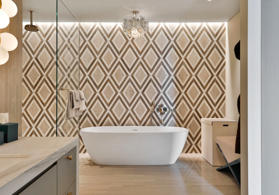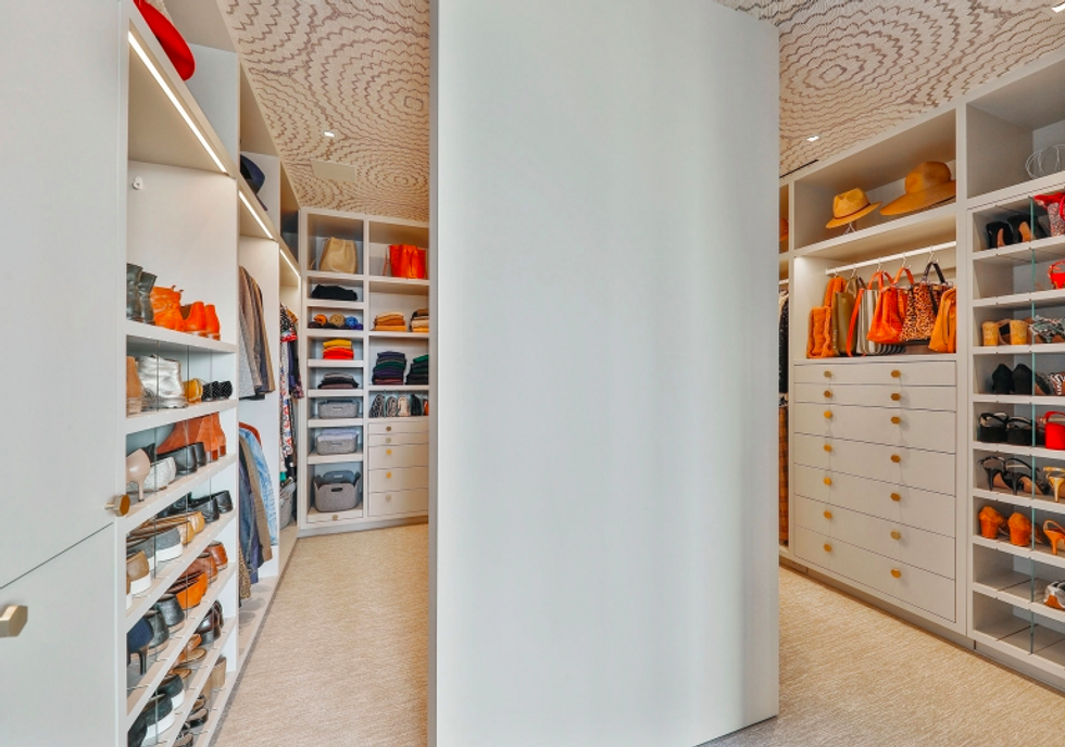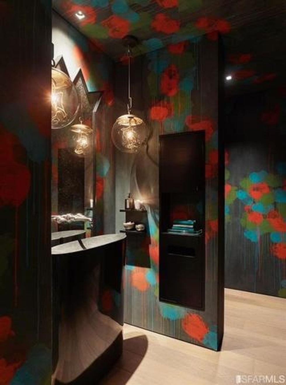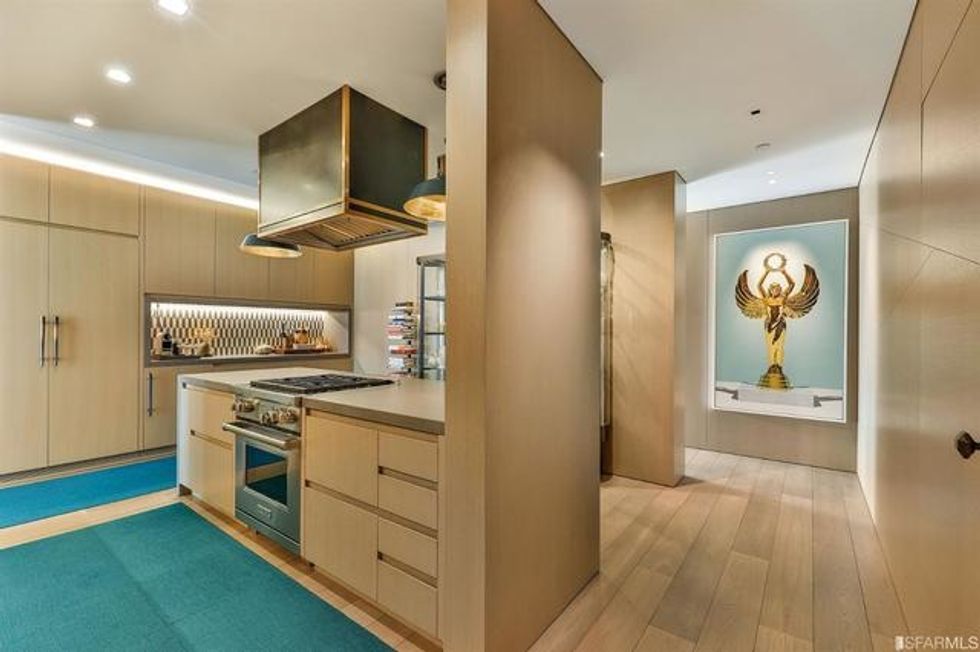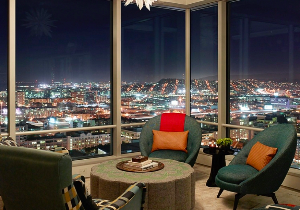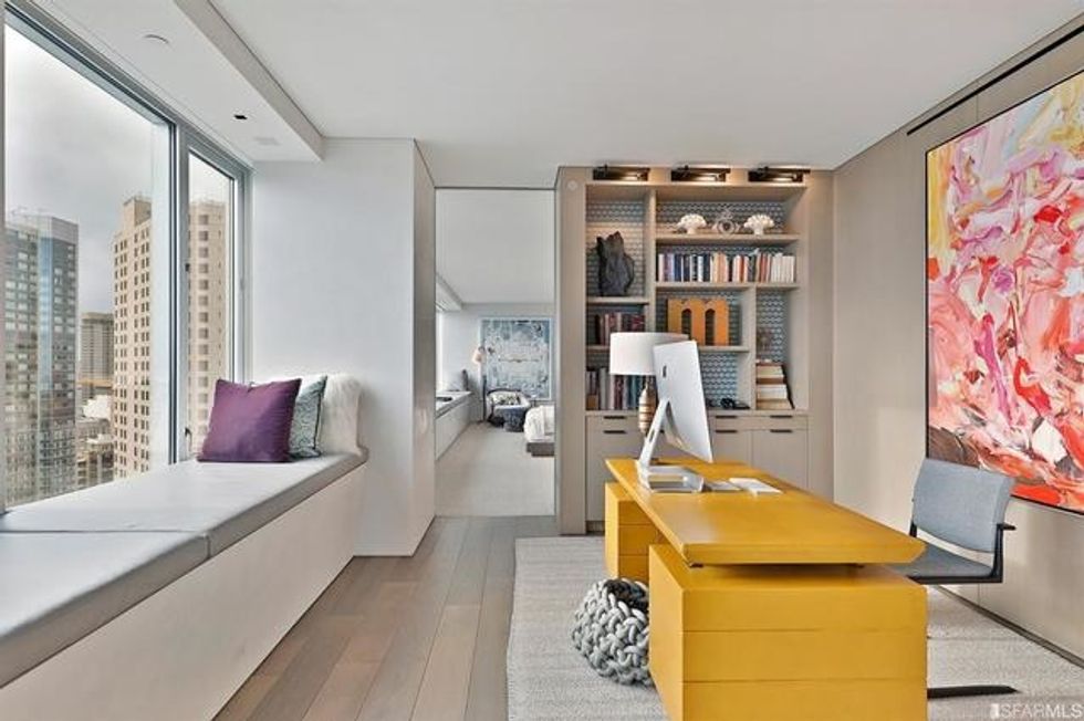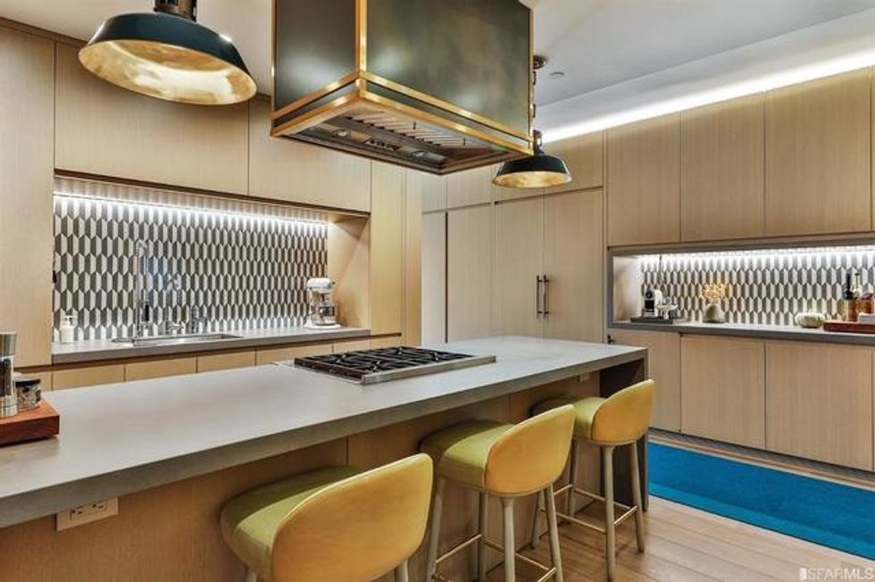 Each space is its own experience. While common areas pop with a coral-toned sofa, scarlet dining chairs, and sunny counter stools, the master bedroom is a study in tranquility, dressed in organic shades of gray and white that exactly echo the colors of San Francisco through the wall of windows opposite the bed. There is a massive walk-in closet, naturally, with a wallpapered ceiling and glam pendant lighting, as well as a spa-like bathroom featuring more midcentury-inspired patterns and a grand soaking tub.
