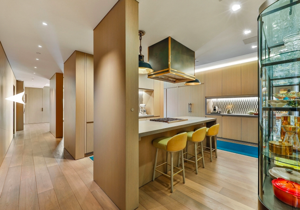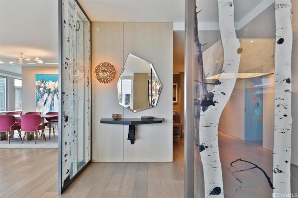 The vibe here is playful, riffing on themes of nature with an etched-glass foyer by artist Amanda Weil that evokes a "forest in the sky," and soothing cloud wallpaper in the second bedroom with the feeling of Japanese painting—each of these earthly moments serving to highlight the apartment's key amenity: those killer sky views outside the many windows.