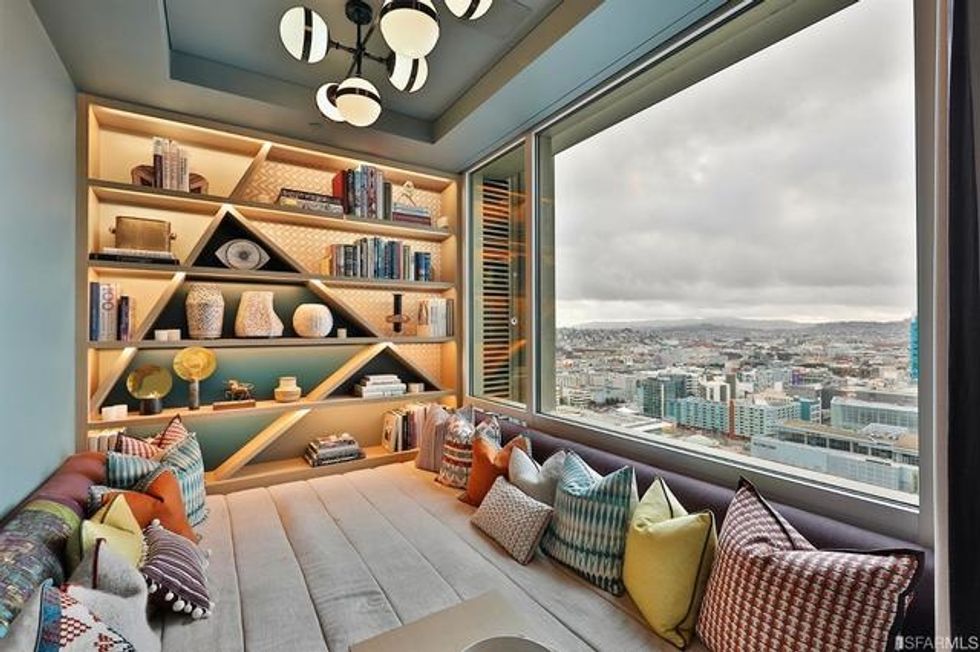 The sweeping apartment is well suited for entertaining, with intimate dedicated areas to host everything from formal dinner parties to casual hangouts in the "cuddle puddle," where a fully cushioned floor and throw pillows make for an enticing spot to lounge or read beneath modular built-in shelving that echoes the architecture through the picture window. There is also, of course, an amply gorgeous kitchen with glass storage for your prettiest dishes and cookware; a countertop range; and seating at the marble breakfast bar.
