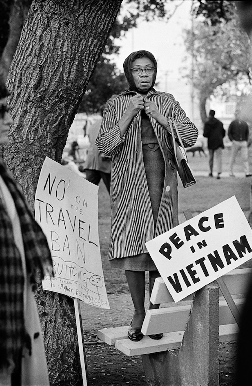 But, as an upcoming exhibit at San Francisco Art Exchange reveals, this lensman to the stars was also captivated by street culture and by the peace movement of the day, and Marshall captured many a peace sign (and protest) during his wanderings around the Bay Area and beyond. He archived the images, catalogued only by an index card scrawled with a peace symbol; they went unnoticed and unpublished until now.