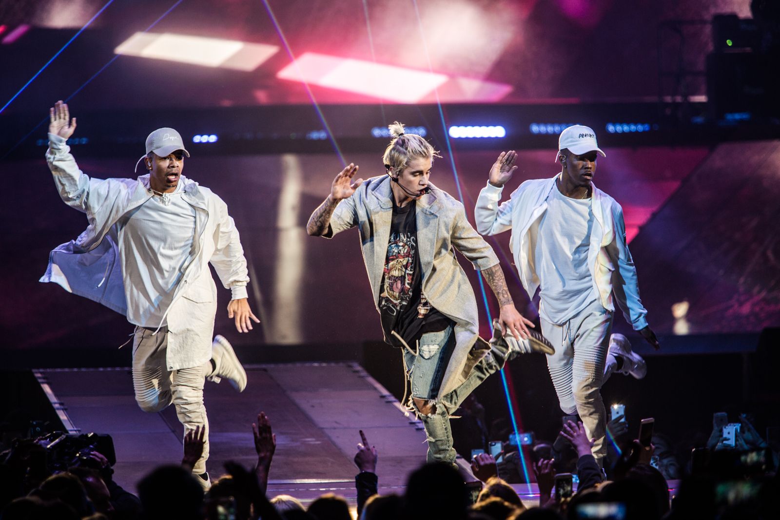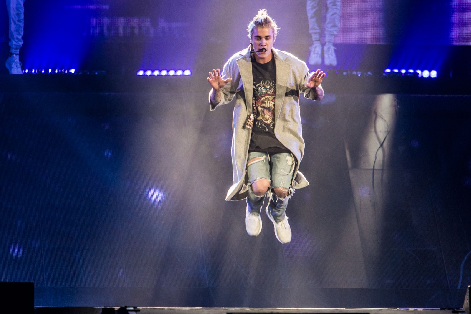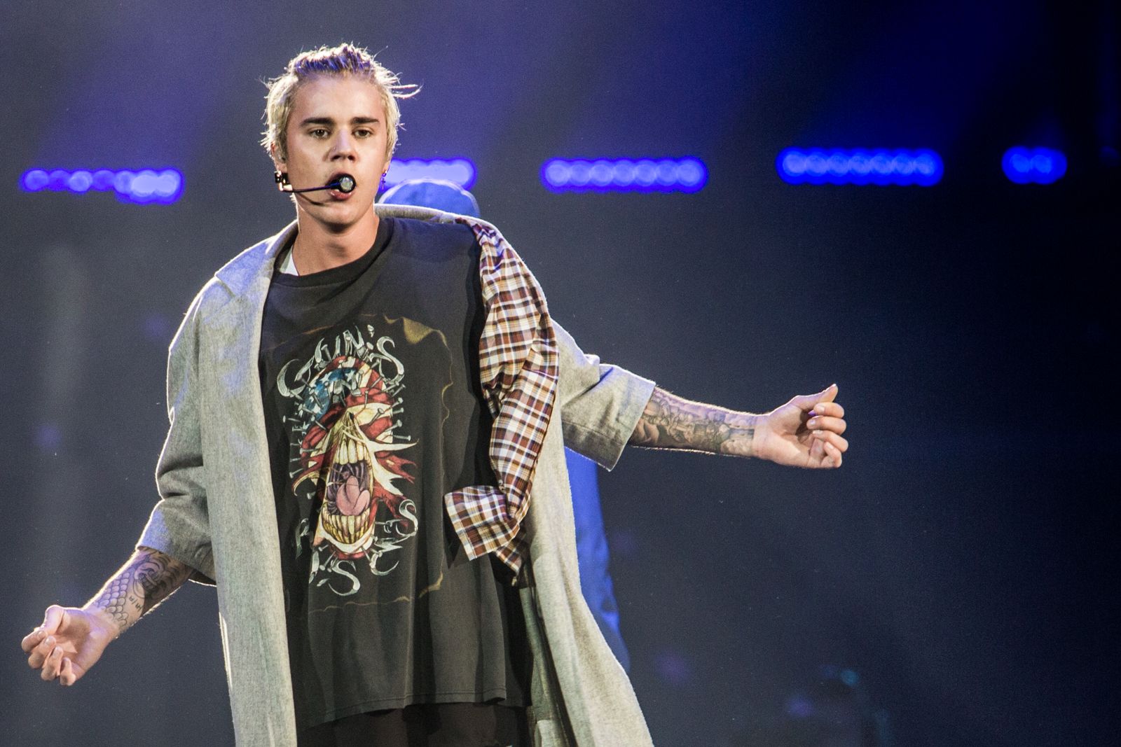 As for Bieber himself, the badboy popstar entered the arena in a glass cube, spelling out "Purpose," "Mark My Words," and a heart on the side. His signature blonde locks were tied back in a messy man bun and he sported a baggy Guns 'N Roses shirt and ... is that a grey bathrobe? Thankfully, he swapped outfits a couple times during the performance.
