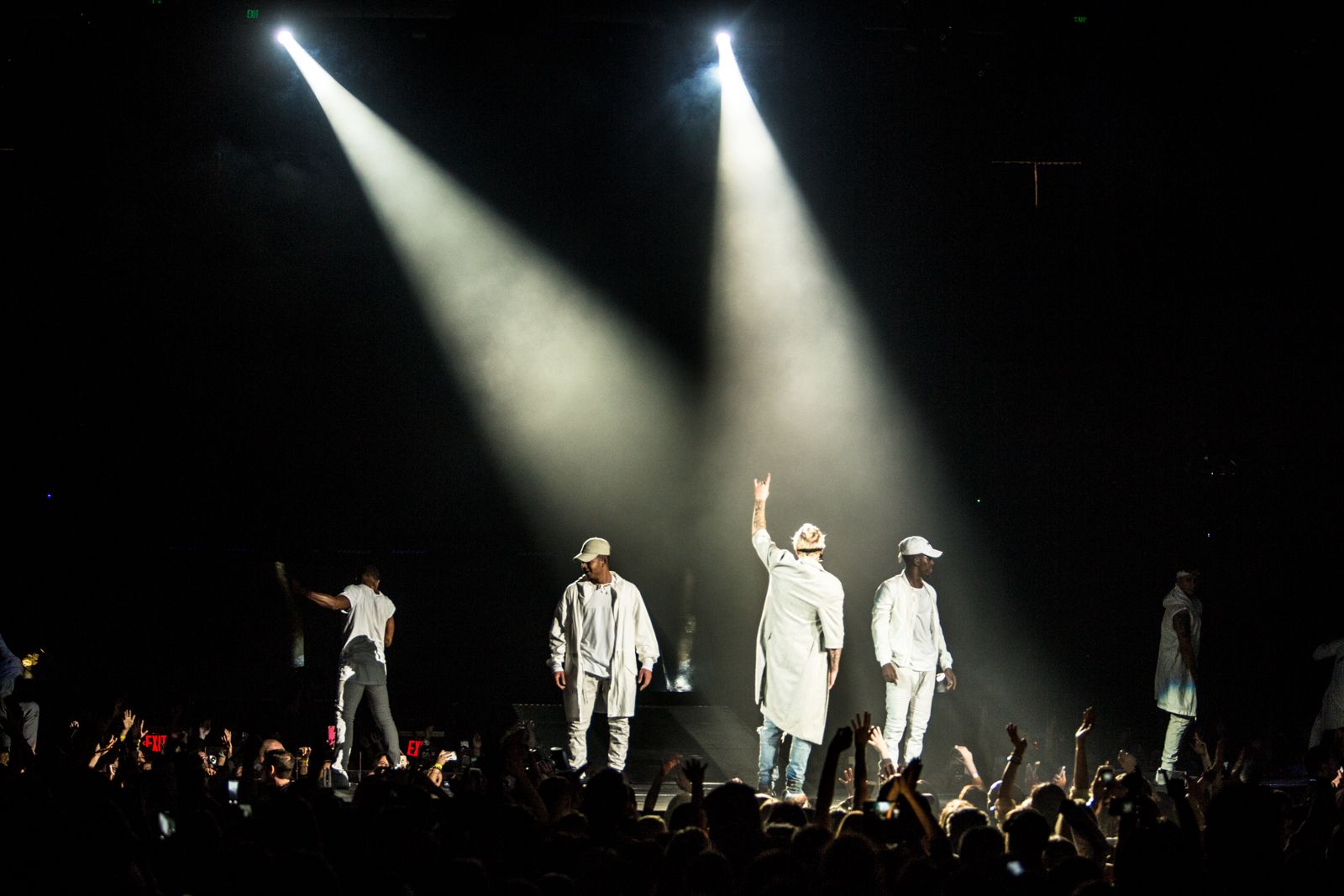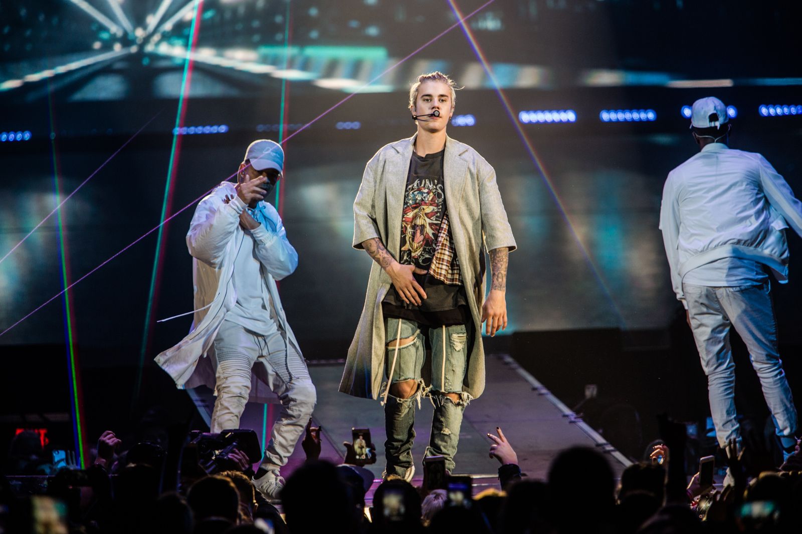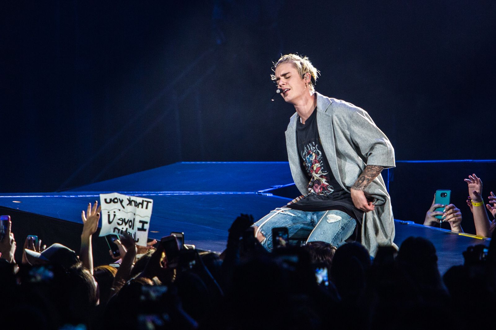 As for Bieber himself, the badboy popstar entered the arena in a glass cube, spelling out "Purpose," "Mark My Words," and a heart on the side. His signature blonde locks were tied back in a messy man bun and he sported a baggy Guns 'N Roses shirt and ... is that a grey bathrobe? Thankfully, he swapped outfits a couple times during the performance.