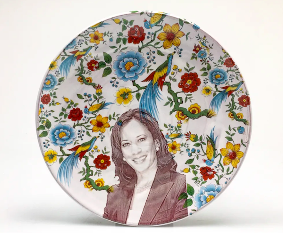 The artist's newest pieces, handcrafted of earthenware clay with a white glossy glaze, feature a smiling black-and-white image of proud Oaklander and vice presidential candidate Kamala Harris (yes!) surrounded by colorful blooms. Not only will the mugs and salad plates brighten your kitchen and your mood, the purchases help support SF's Museum of Craft and Design, which, like all museums, could really use the help right now.