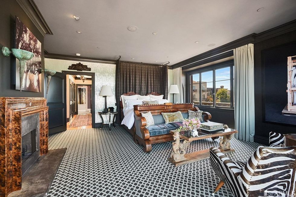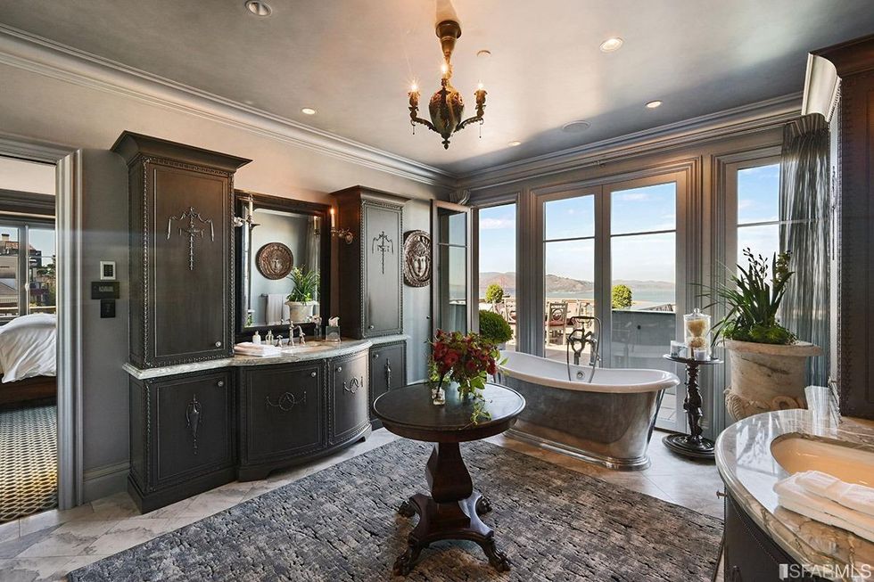 The private quarters are truly grand. The master suite has a sprawling walk-in closet; the master bath with dual vanities and a standalone soaking tub against a wall of glass. Each bedroom has its own unique character with a different hue, wall pattern, and custom flooring.