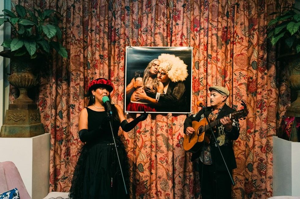 That’s also true for the members of La Pocha Nostra, an arts collective founded in 1993 in Los Angeles by Guillermo Gómez-Peña and now based in San Francisco, with Gómez-Peña and Balitronica as co-artistic directors. The maximalism of the former church, full of patterned drapes, hidden spaces, and velvet couches, goes well with the maximalism of La Pocha who, on opening night, put on the roving performance The History of Art in 15 Minutes with music, songs, poetry, and special appearances by Flower Piano Festival musicians.