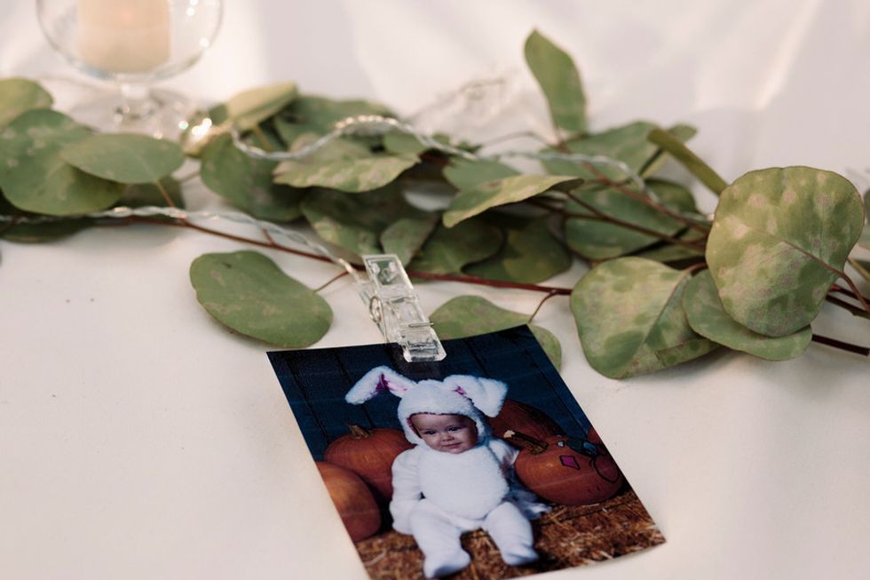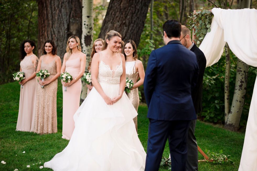 Childers—dressed in a tiered, flowing gown and glittery sandals—passed over a path of rose petals to meet her hubby-to-be at the rustic wedding arch trimmed with white linens and eucalyptus. There her bridesmaids waited, wearing blush-hued, floor-length dresses with gilded touches (a special sequined number was saved for her maid of honor), each carrying a bundle of ivory roses with eucalyptus to match the groomsmen's boutonnieres. The lovebirds said their vows and then made their way back up the aisle to the sound of Stevie Wonder.