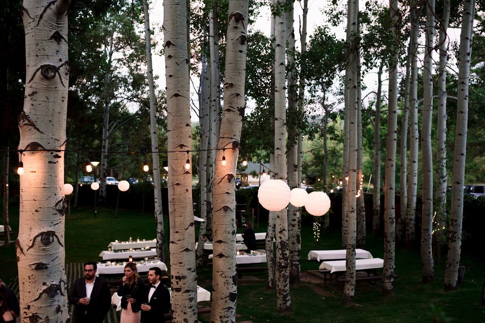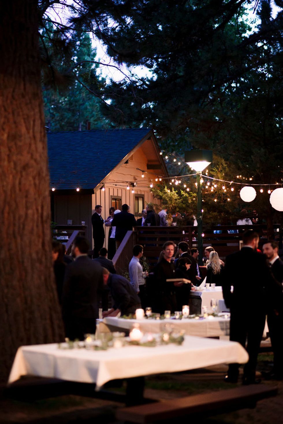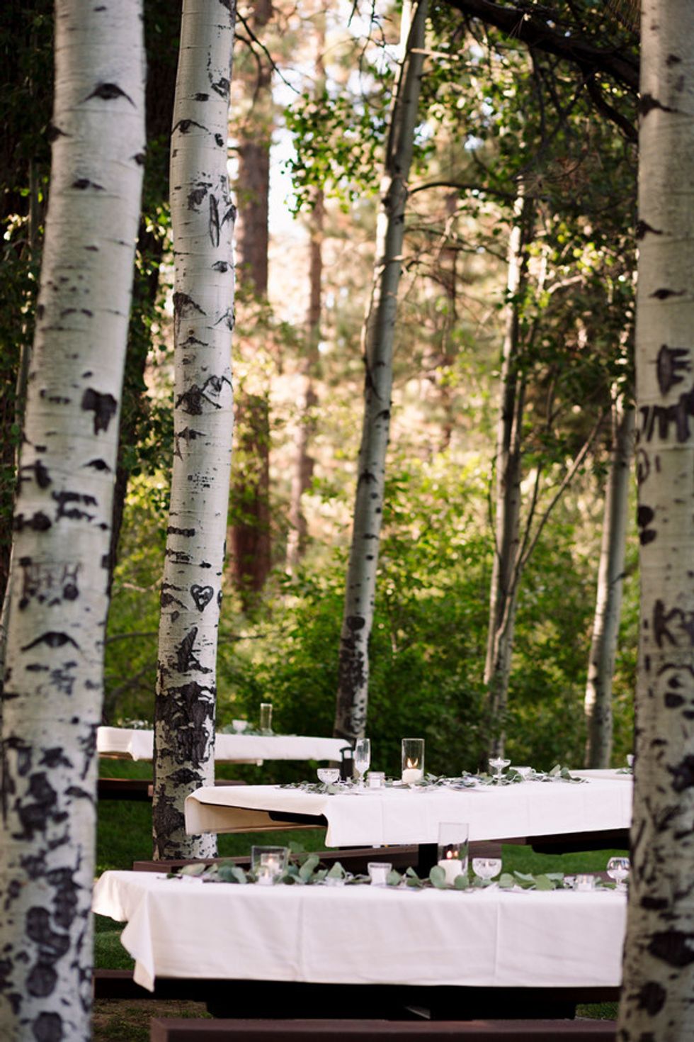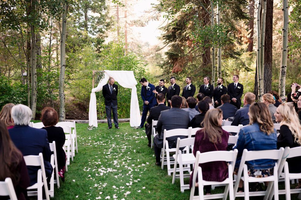 After some photos and a shot of whiskey for all, the group took off to Incline Village's Aspen Grove, named for its charming wooded setting on Third Creek—if guests looked closely, they would see the initials of couples who'd wed here before carved into the trees.