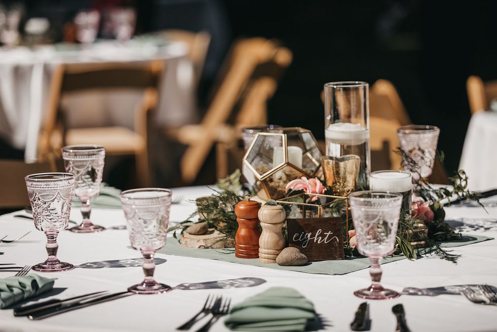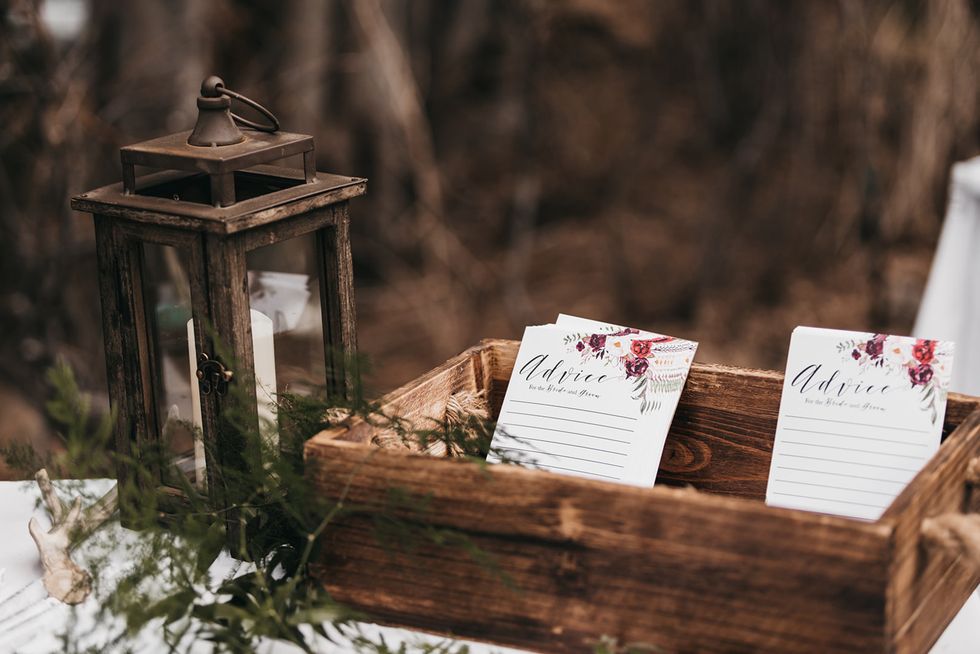 With the surrounding forest lending all the fairytale feels, all it took was a small bit of rustic decor with some "boho vibes" to set the perfect scene. A few somethings-blue were inspired by the bride's home state—"I am from Alaska and our state flower is the Forget-Me-Not"—and terrariums bursting with blooms topped the tables at the reception. Richard, who dabbles in calligraphy, wrote the escort cards, while his longtime friend officiated.