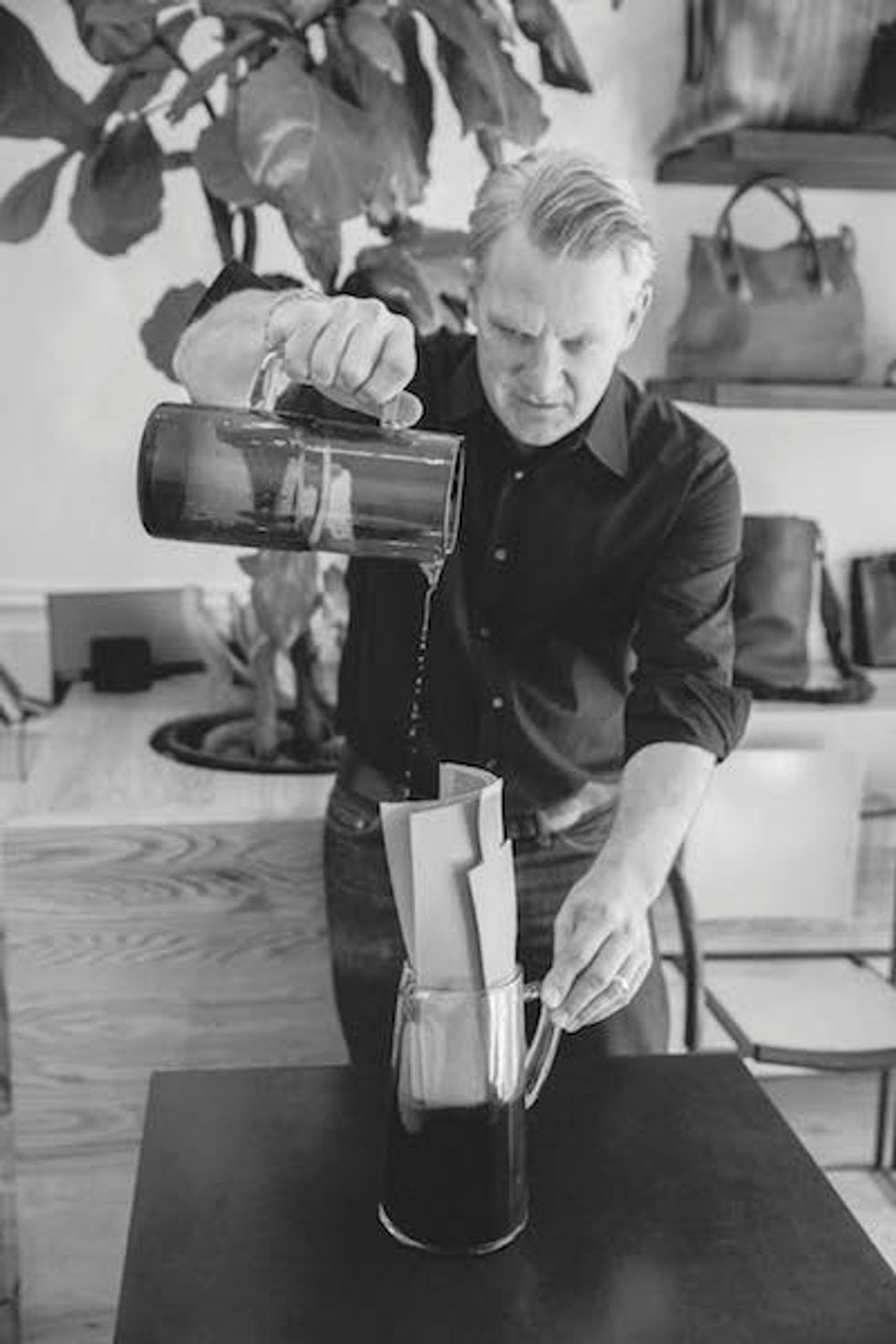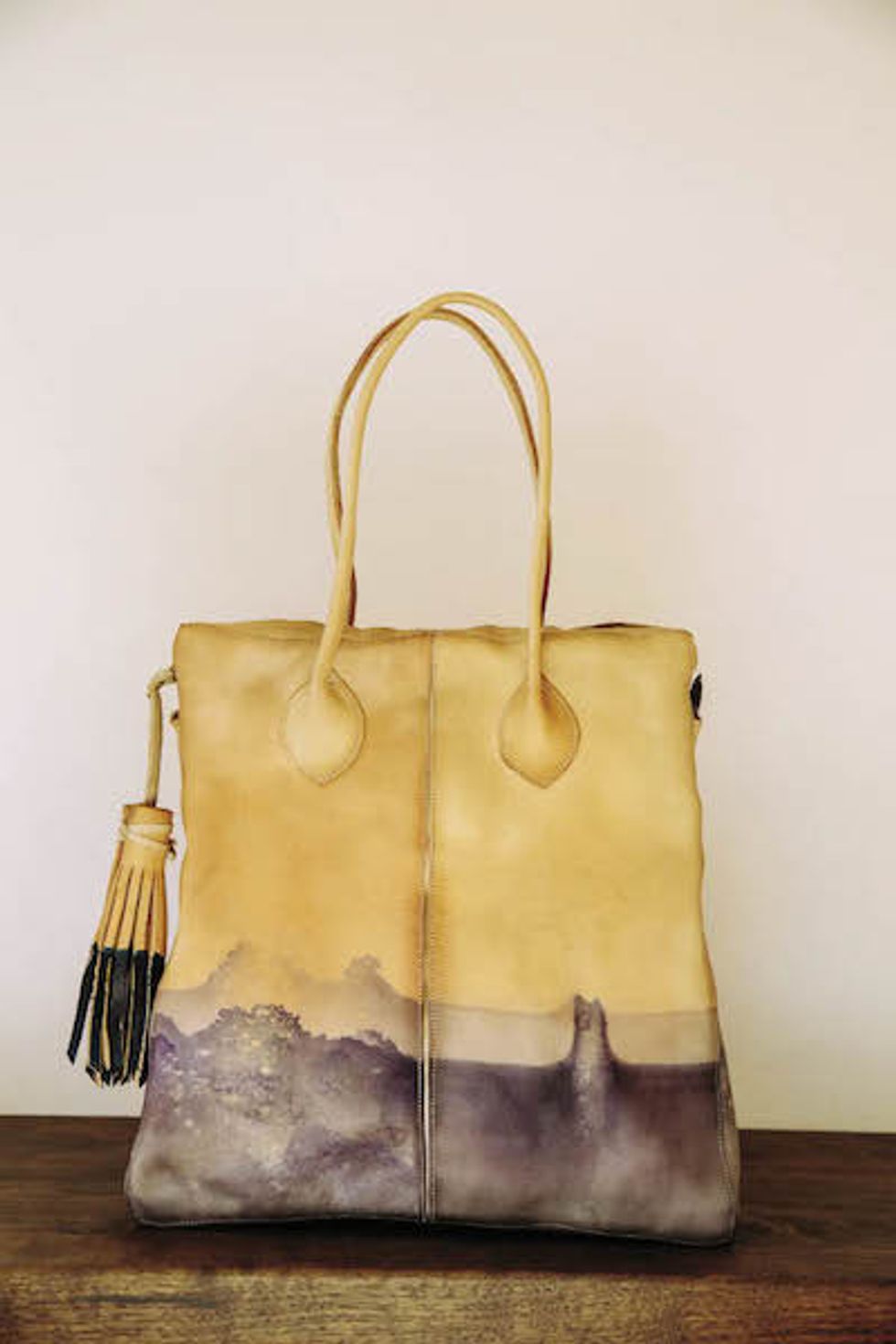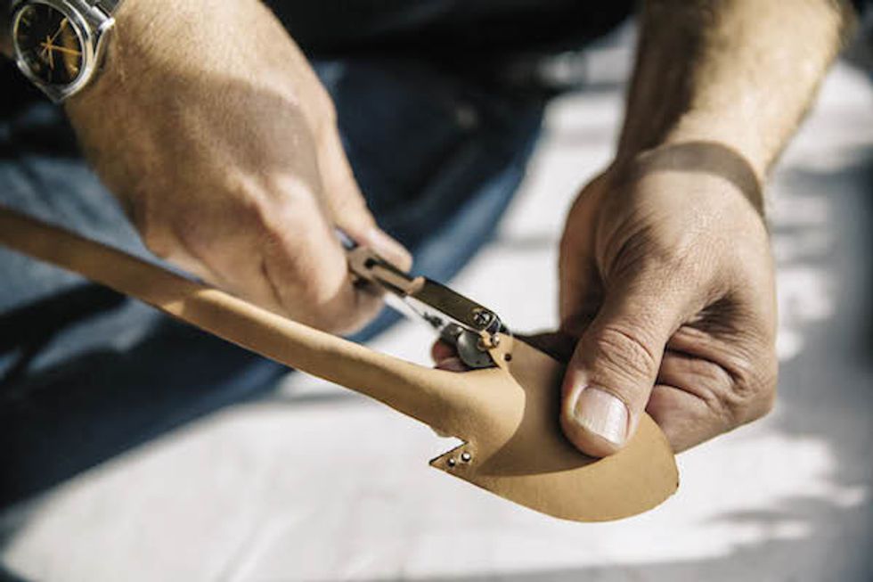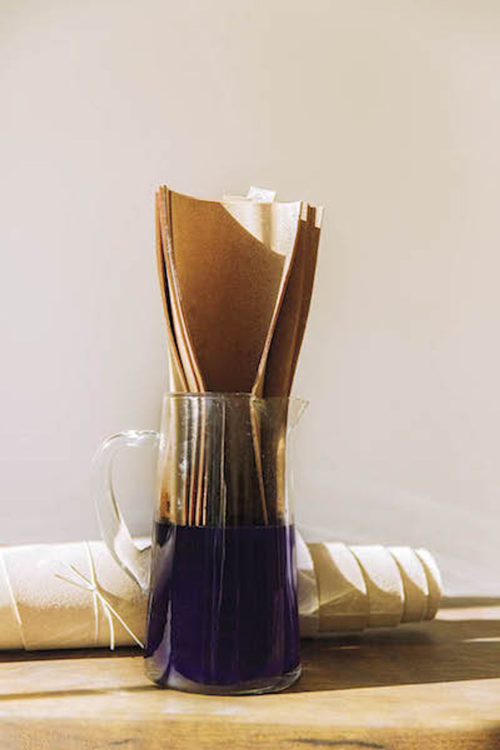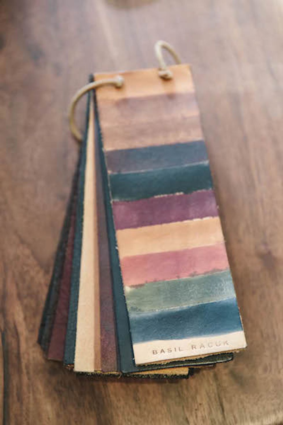 Racuk soaks leather panels in a pitcher of indigo dye, which he refills for three days, in a process he calls “synchronistic.” The result is unknown until the end, allowing for uniqueness and spontaneity in each design.“It’s very Northern Californian—we like to let things occur naturally,” he says.