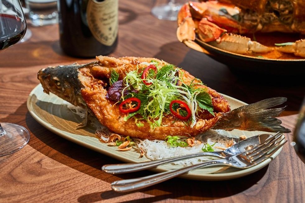 It was just three weeks ago that Crustacean made its big transition, moving from Lower Nob Hill to a large, lovely space in the Financial District (195 Pine St.) with soaring ceilings, architectural details reflecting Vietnamese heritage and aesthetics—like a pair of 18th-century carved wooden doors—and a “secret kitchen” in the back for preparing signatures like Helene An’s famed garlic noodles.