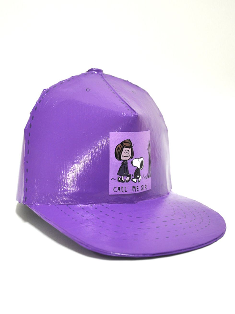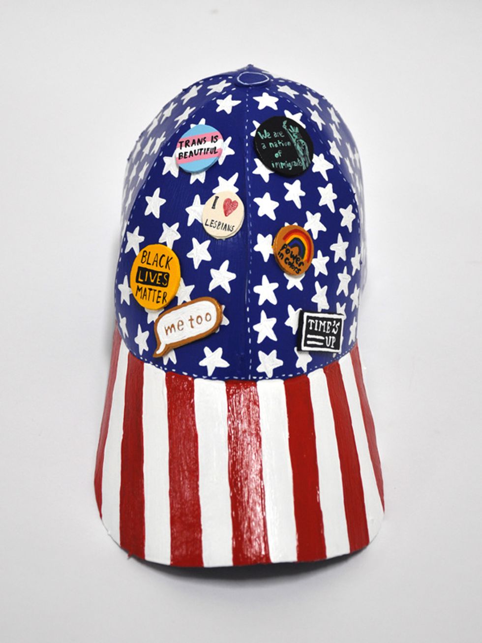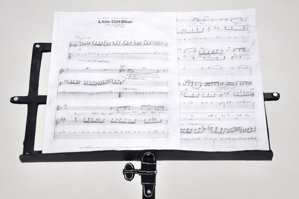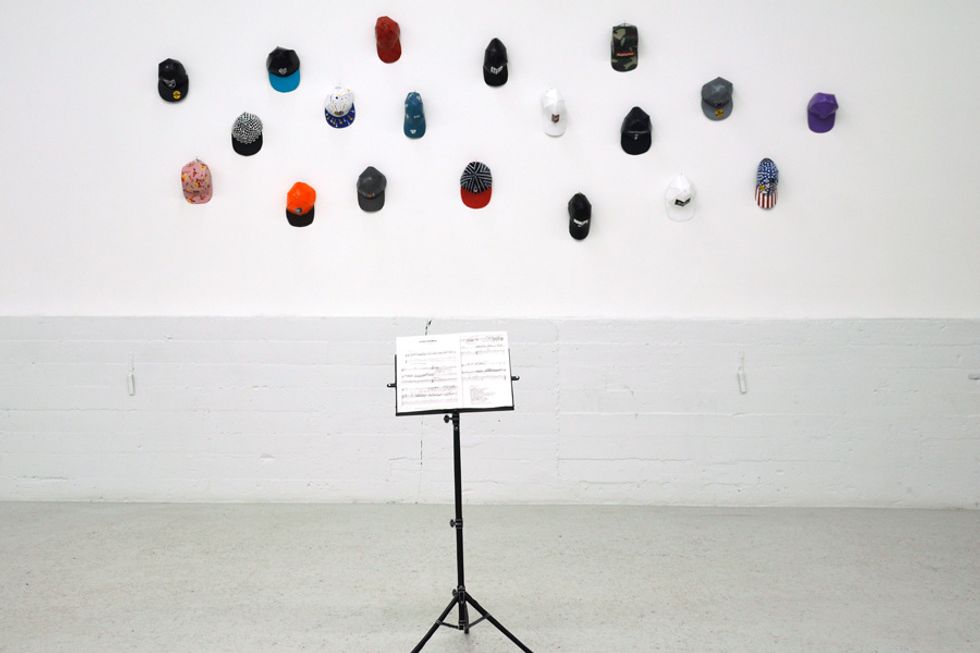 Such familiar moments come in a series of 19 paper baseball caps emblazoned with logos—the Raiders, Gucci, Rhythm Nation, Peppermint Patty—meant to represent all different kinds of people coming together; the personalities here are the audience and the choir, perhaps a crowd in protest, raising their silent voices before a music stand with sheet music open to Little Girl Blue.