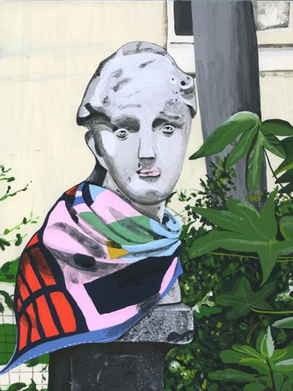 But while it all sounds so serious, there is plenty of humor here, too, with hot pink paper sandals, paintings of accessorized statuary, and vibrant colors lending plenty of levity and moments of sheer delight. "I guess I just want people to have hope—and know you don't need a boy to cheer you up."
