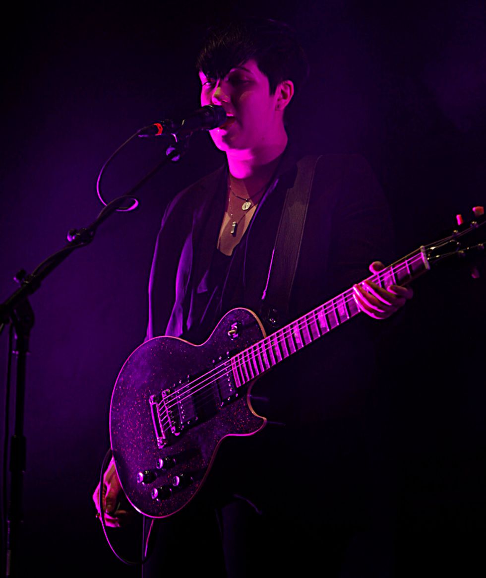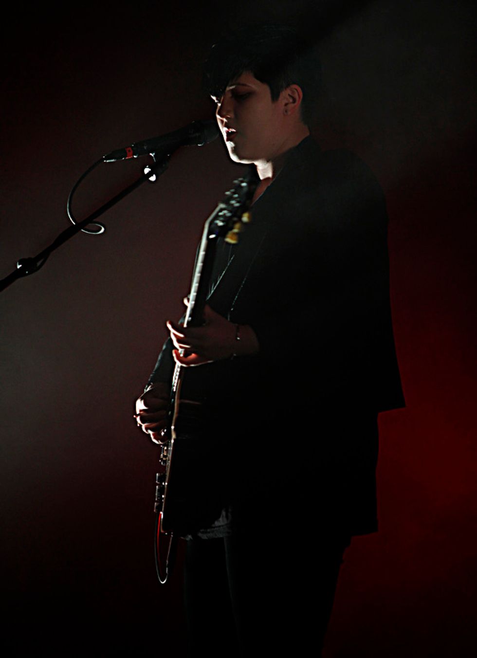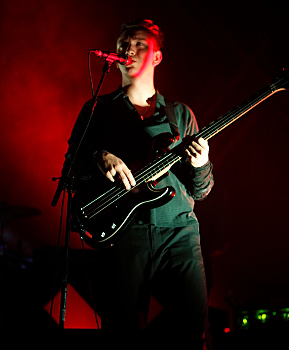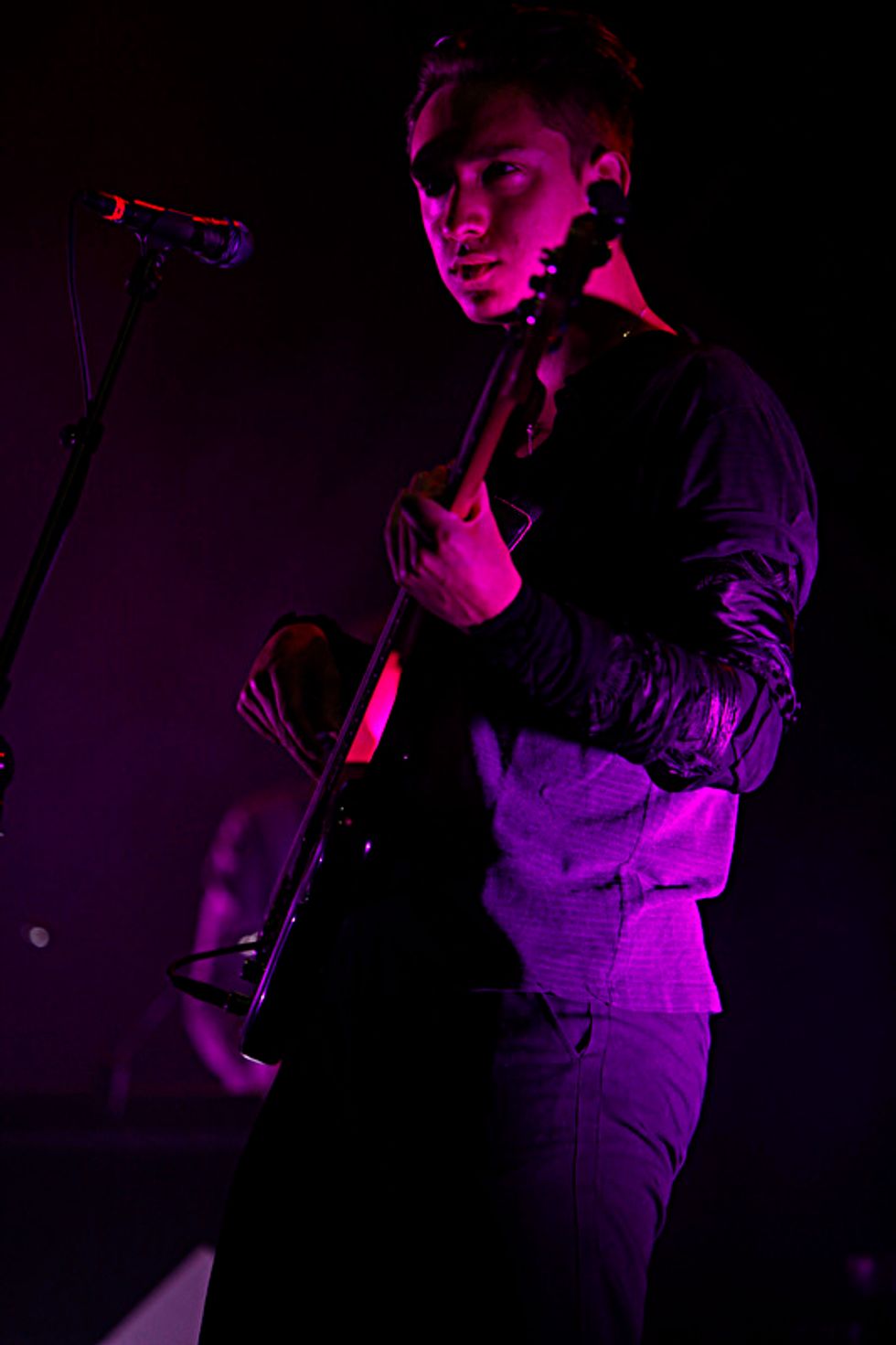 Hunched over his bass with feet planted securely on stage, Sim was easily the most active musician on stage, deeply swaying to the beat with his bass, weight shifting from one foot to another. A few songs in, Sim, all long limbs and blowout hairdo, dropped his bass, stood on an amp at front and center stage, and looked at his audience like he wanted to swallow us while singing the slow, bitter-sweet lyrics of “Fantasy.”