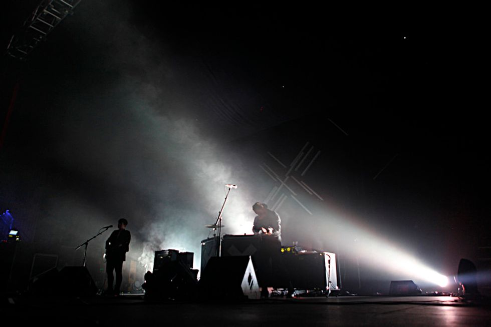 Enter special effects: whatever large sum The xx must have thrown down for their light show, the investment was a good one. Although heavy-handed at times (for instance, the crowd was slowly lit up by bright, white lights as Madley-Croft, shy and sultry, sang the chorus to “Shelter”: Maybe I had said/Something that was wrong/Can I make it better/With the lights turned on. And during “Stars,” the band had a backdrop of twinkling lights), what the band was lacking in arena-rock stage presence was made up for by the accompaniment of pretty lights and jaw-shatteringly loud bass beats.