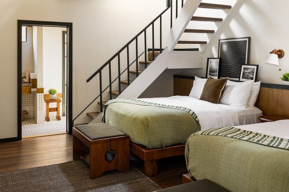 It’s a little unsettling, this secluded hillside unpolluted by light, but the lodge's reception is an antidote to the darkness, warm and welcoming, with sunny colors in muted shades and a funky ‘70s vibe courtesy of Brooklyn designers Home Studios. In the great room, woven tapestries hang and stacks of windows wrap around a large tiled fireplace. Built-in couches line marigold walls in the lounge, accented by wood paneling and a giant game of Connect 4.