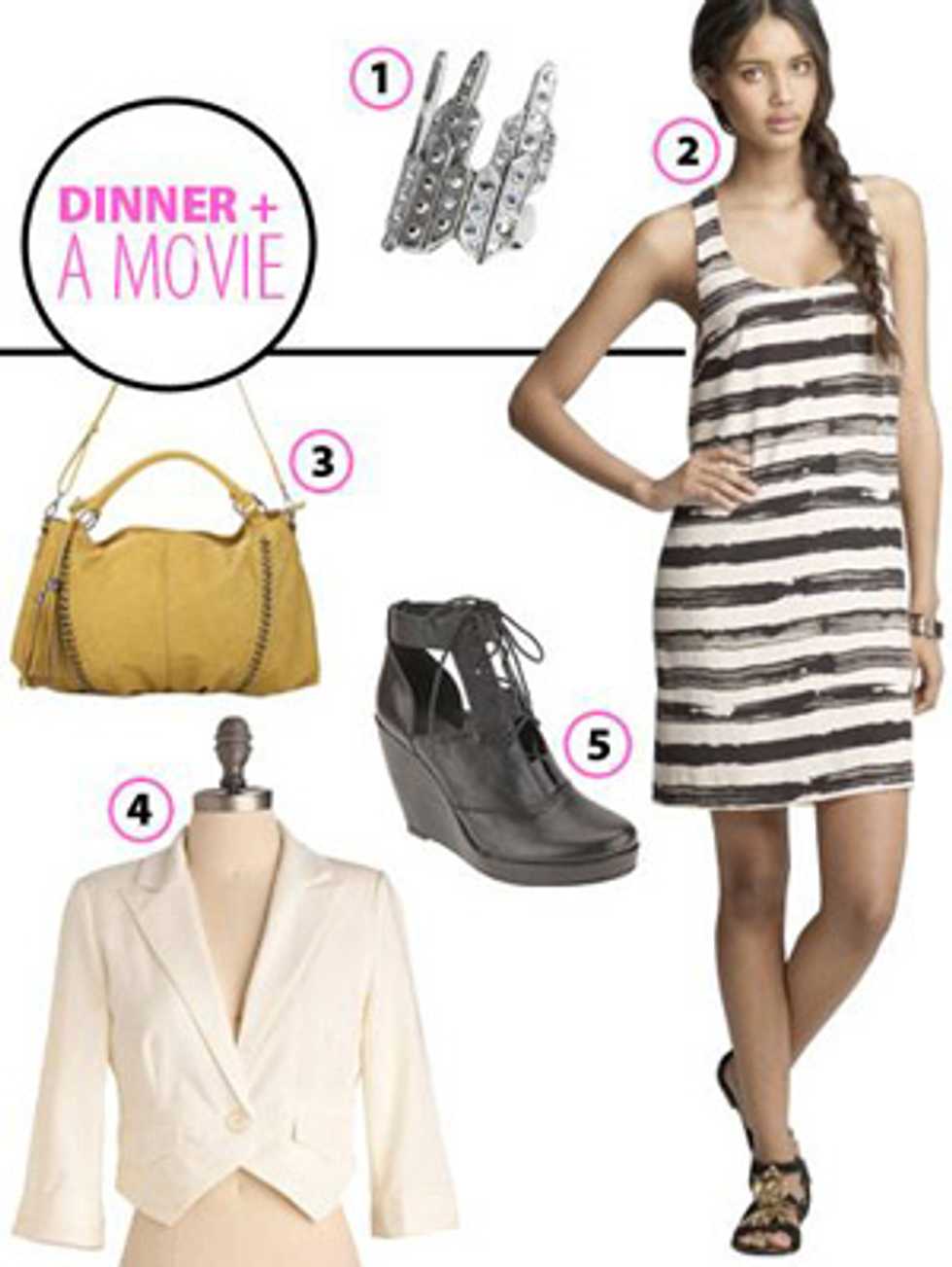 For this week's look, we decided to compile an (almost) all black and white date ensemble as an ode to the classic films we'll be glue to. And from the painted stripe silk dress to the Metropolis-inspired skyscraper ring, you're sure to steal the show: