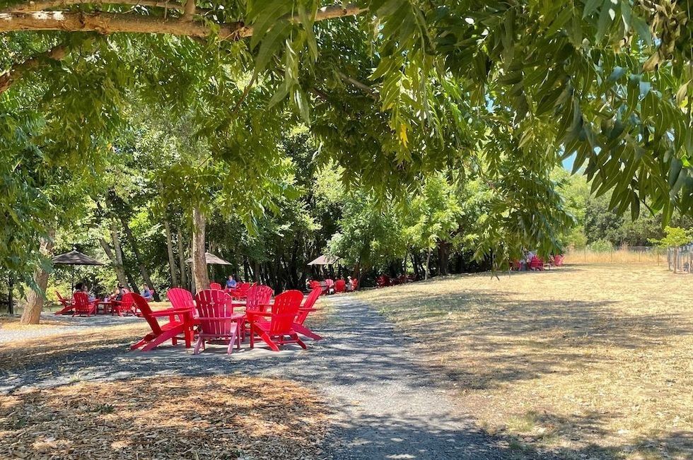 The red Adirondacks in the Creekside Lounge are reserved for Truett Hurst members, but there are several lovely outdoor spaces for drop-ins to enjoy wine and picnics.