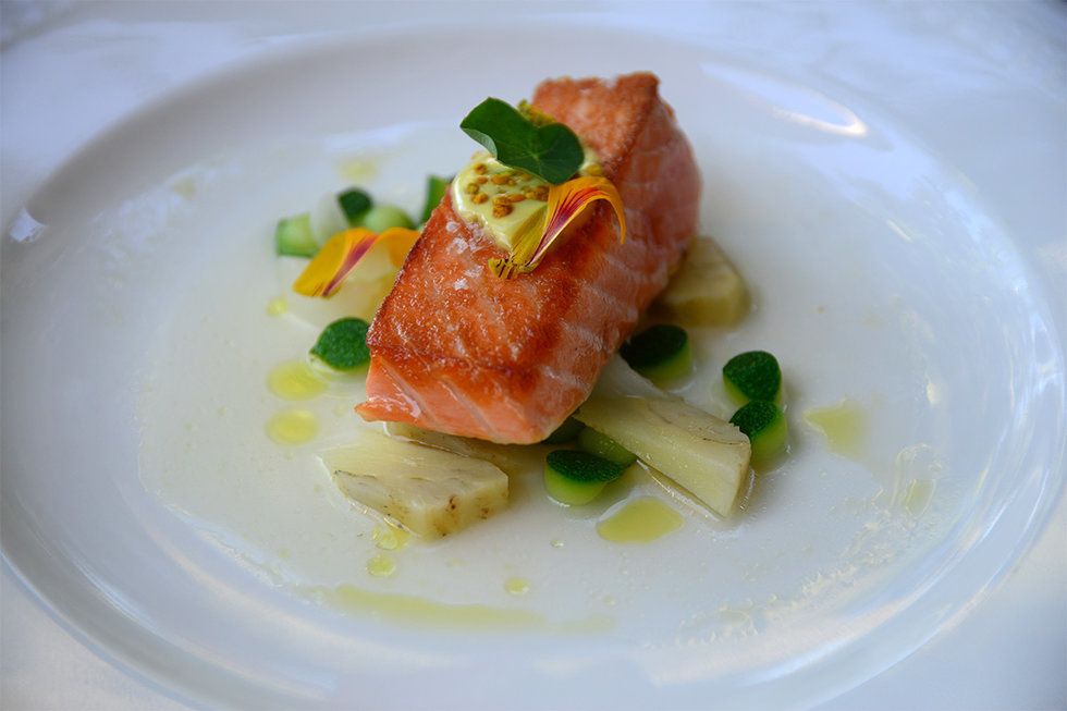 This feeling persisted in the savory finale: an incredibly rich, almost buttery cut of king salmon, lightly seared and set atop some tender zucchini buttons and succulent slices of artichoke simmered in a barigoule broth, and garnished with aioli, a scattering of bee pollen, and a peppery-sweet nasturtium leaf.