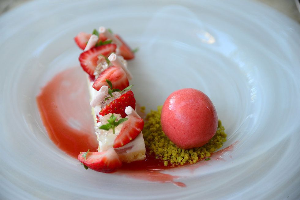 Madrona Manor's pastry chef, Oanh "Sally" Nguyen, brought things to a close with a sophisticated spin on strawberries and cream. The berries, small and vividly flavorful Chandlers from the garden, were arranged on a slender catwalk of sponge cake and crème fraîche and, in between them, little pinkish cylinders of delicately sweet meringue and gleaming jewel-like bits of rosé and rose petal gelée. Beside this confection, a scoop of strawberry sorbet sweated invitingly on a mound of pistachio streusel, and as the sun hovered at the horizon in a hesitant farewell, the hills to the east lit up in a warm, red glow.