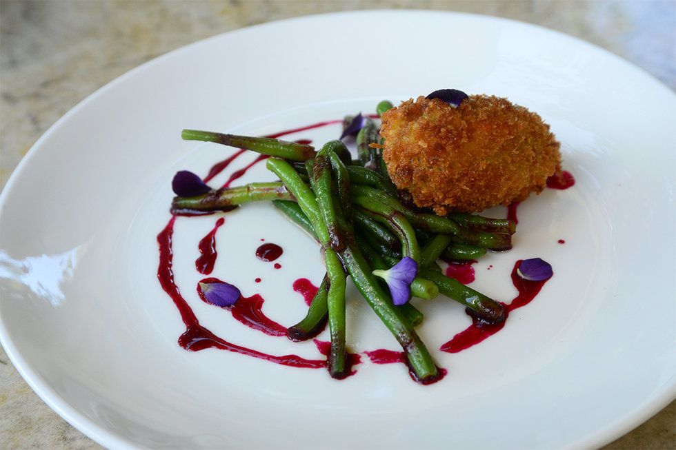 And then a squash blossom: stuffed with creamy and ever so delicately funky goat cheese, dredged in panko and fried to a delightful crunch, perched on a sumptuous green heap of haricots verts and garnished with a drizzle of beet syrup and little, purple-blue petals of Johnny-jump-up.