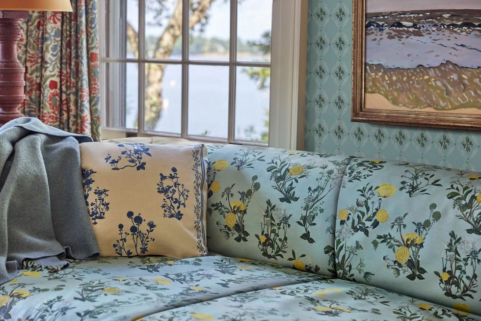 A labor of love, the spark for the collection came from watercolors she painted during one lovely summer spent in Maine, surrounded by coastal foliage, bees, and blooms. The resulting floral motifs, inspired by her New England days, exude a romantic vintage vibe yet feel utterly fresh. The opulent fabrics and wallpaper come in the same four patterns (Peony Chintz, Meadow, Sunblock, and Busy Bee) and colorways—all très chic. Plus, there's the Lucia game table and Sara cabinet, both crafted of rich cherry and redwood burl and both statement-making pieces.