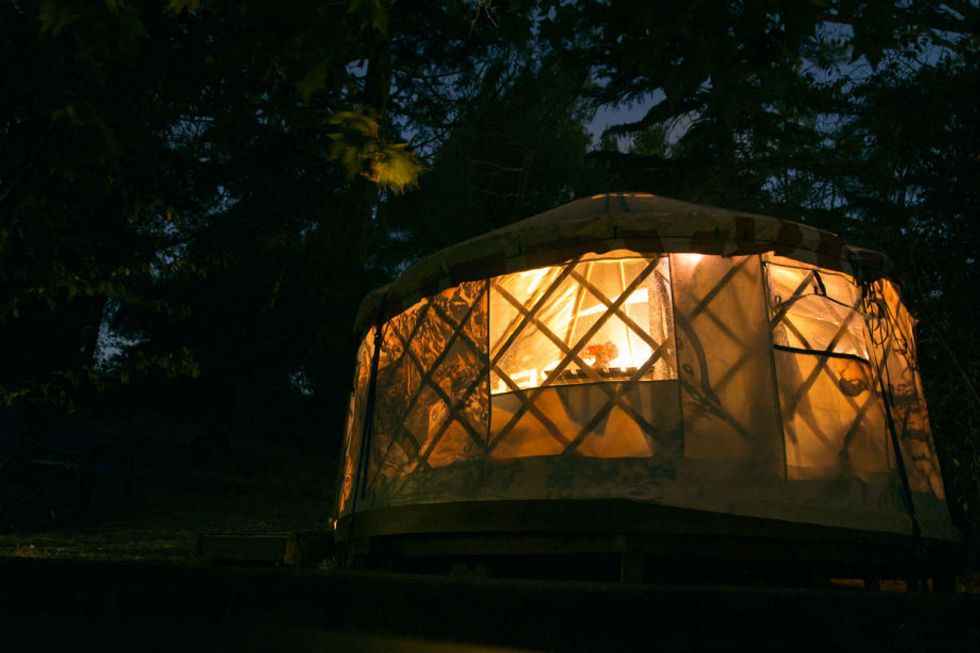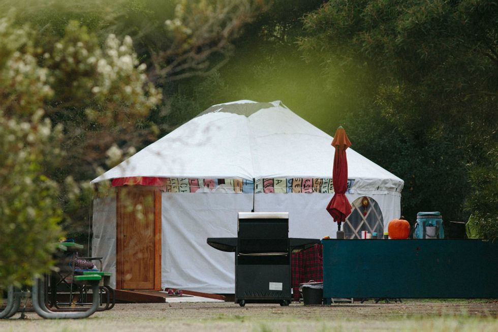 Bedrooms: Two rentable yurts and four tent-only walk-in sites; cooking areas, fire pits, and watering stations can be found at the yurt locations.