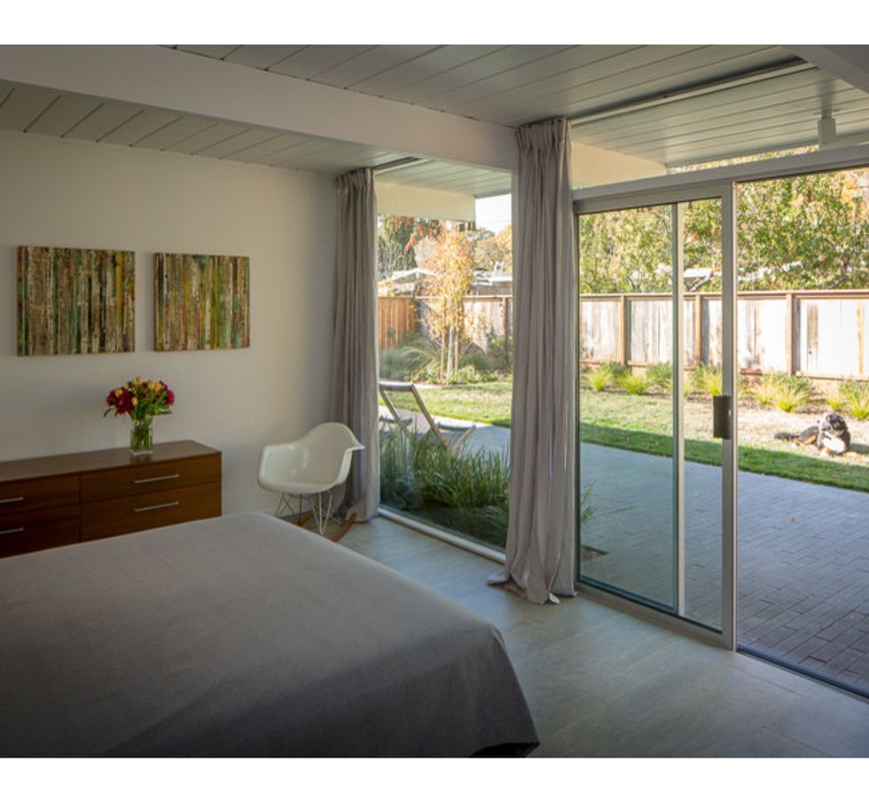 The master bedroom, like most of the rooms in the house, is oriented toward the backyard. "We replaced all the windows and doors with double-paned, insulated models," Stephen says. They used porcelain tile that looks like board-formed concrete throughout the house.
