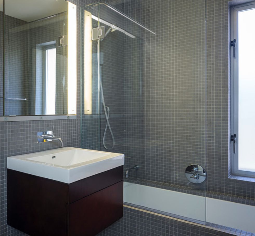 In another child-friendly move, Stephen designed a custom glass shower door that swings inward, toward the showerhead. The bathroom is small, and the couple didn't want to cut it in half with a shower curtain. A wall-hung vanity also makes the room feel more open.