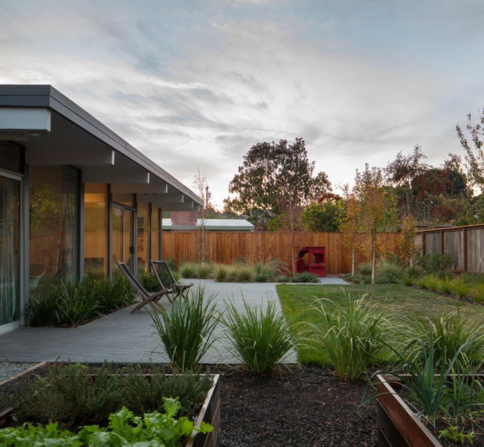 The Shoup family moved into a non-atrium Eichler. Stephen created his own courtyard by installing a fence with horizontal planks in the front yard. Taya, who works at a landscape architecture firm, chose drought-tolerant grasses and olive trees for the front garden.