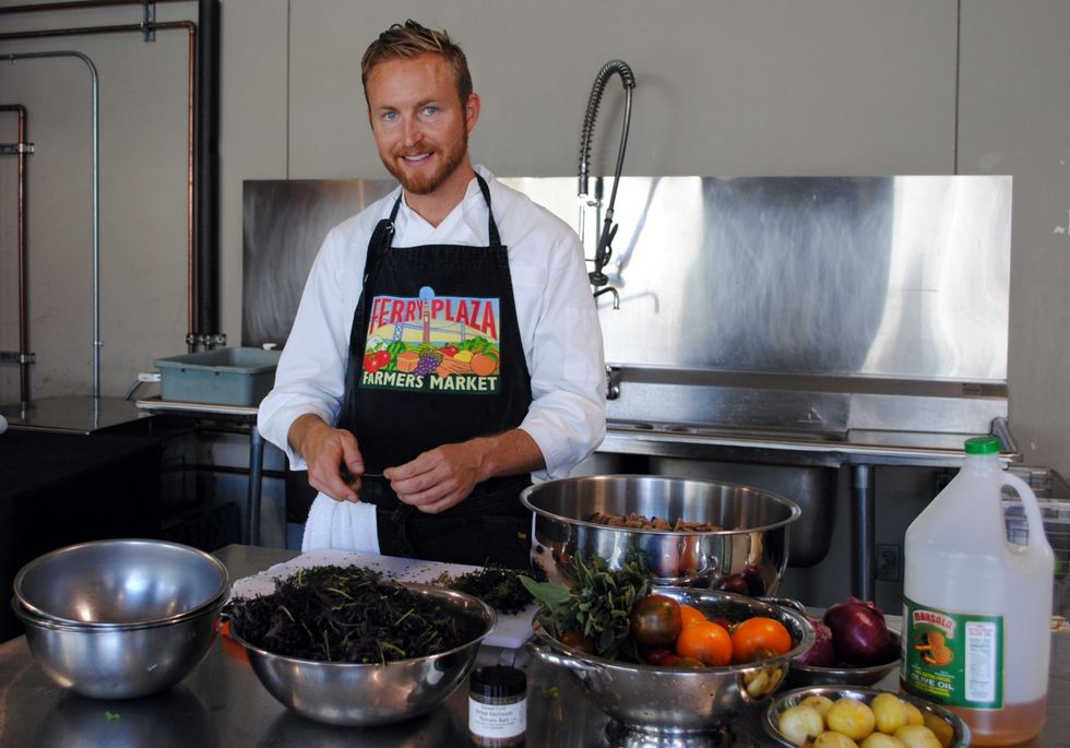 Chef Joshua Clever was in the CUESA kitchen this week to show us a simple bread salad recipe featuring ingredients that embody the market in early fall. Joshua had stopped by to join us at Tuesday’s Food Wise Booth-- one of two free cooking programs offered at the Ferry Plaza Farmers Market each week.