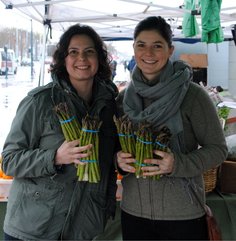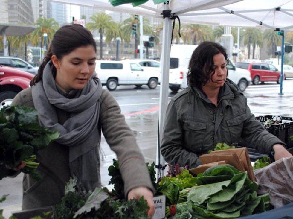 Allison Mountford, executive chef and owner of Square Meals, and Sarah Henkin, her new operations director, were at the Thursday market recently to shop for ingredients for their weekly changing menu. Allison started Square Meals shortly after graduating from culinary school in 2006 and the business has since grown from a private chef service to a brick-and-mortar establishment in Polk Gulch, which opened last December. She brought on Sarah—a classmate from her culinary school days and former market chef at the Ferry Plaza Farmers Market—to help expand the menu and further develop their catering and home delivery services.
