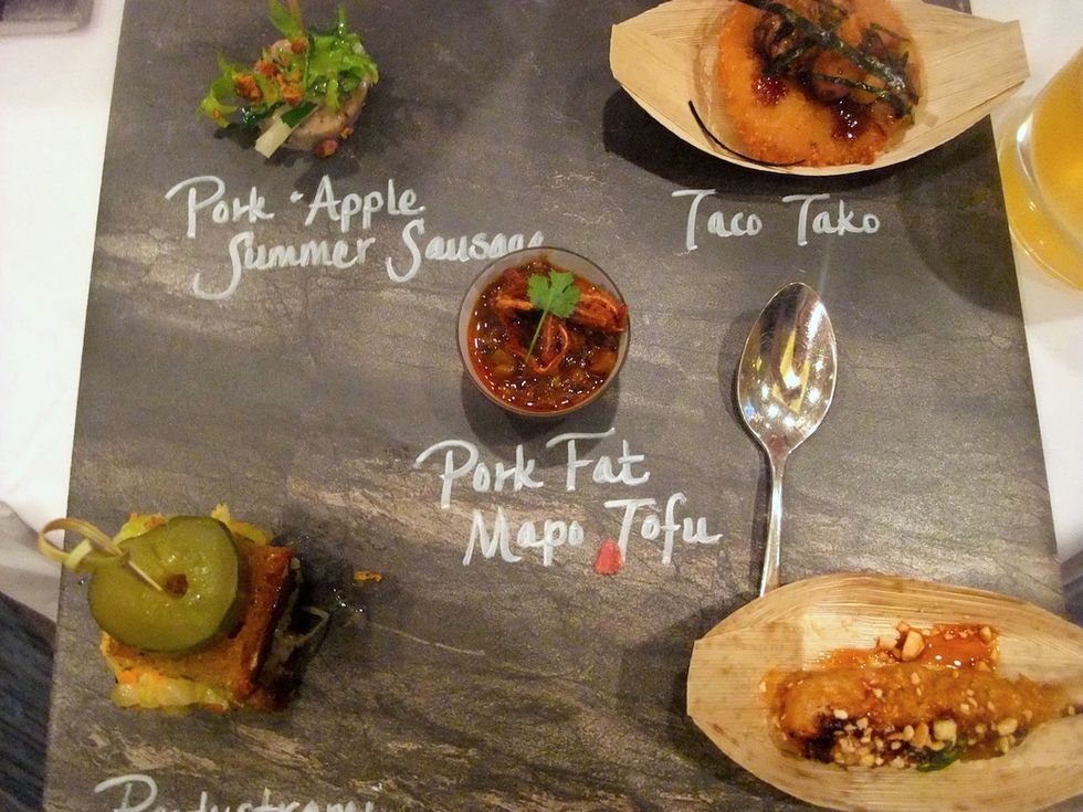 A seasoned culinary competitor, Sobel said he knew he needed make major impact with each bite and felt Asian flavors would be the key to his success. A trip to Asia last September with Michael Mina, which included stints in Thailand and Korea, greatly influenced his game. His Asian dishes included Chiang Mai meatballs on a skewer, Ma Po Tofu made from fatback and spicy braised pig parts, chili oil and cilantro, and "Tako Taco" pork katsu with shaved octopus.