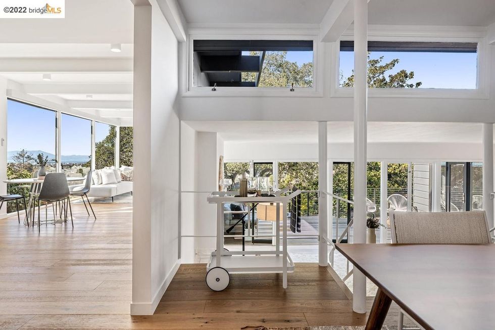 Low profile from the street with frosted glass doors covering the attached two-car garage, the house opens to a spacious feel, with nearly 3,000 square feet and wide windows at the back of the house that let in natural light and treetop views from all the main communal spaces.